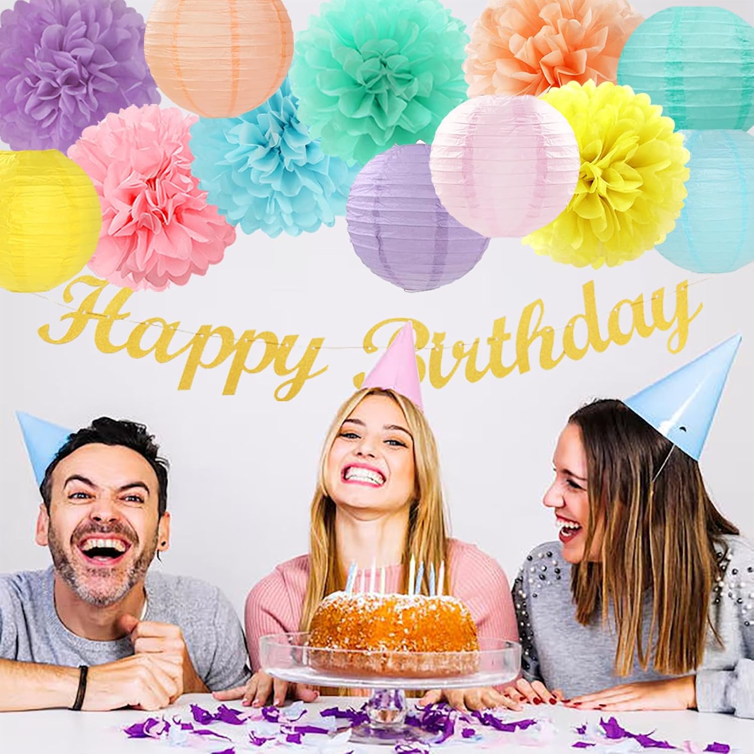 Pastel Rainbow Colorful Party-Decorations Paper Flowers Lanterns - 15PCS Birthday Classroom Baby Shower Tissue Pom Poms Streamers, Macaron Carnival Theme Hanging Supplies Decor Hugfond