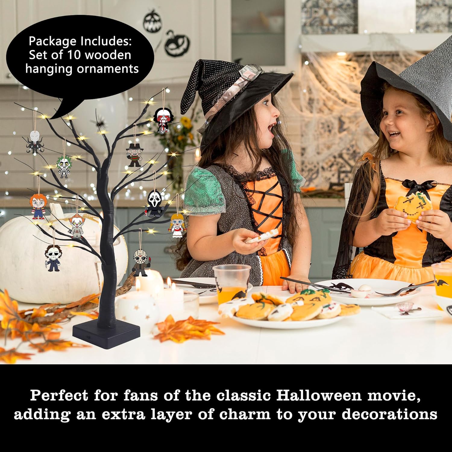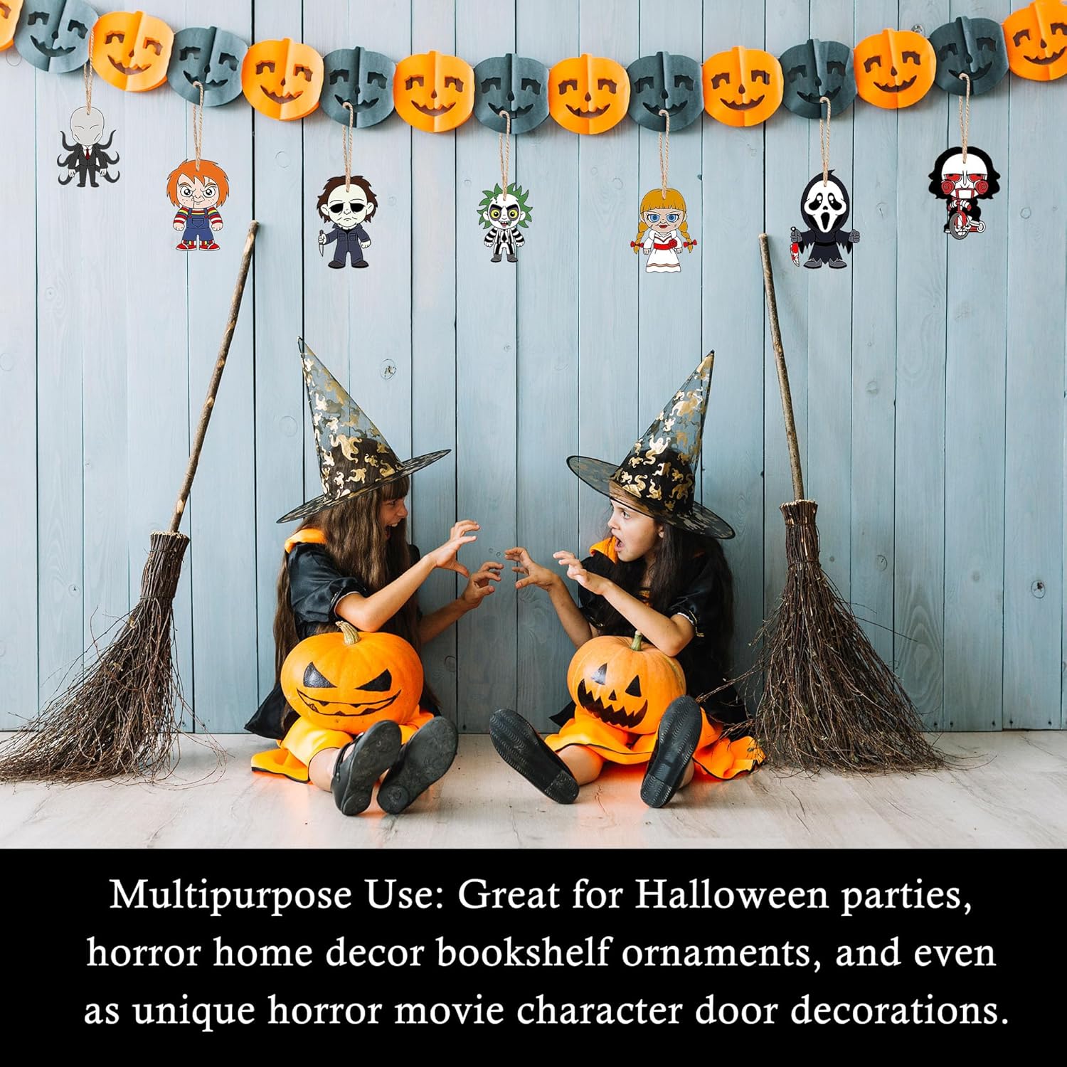 - Horror Movie Decorations: Add a spooky touch to your Halloween tree with these horror-themed wooden ornaments. Comes with a string pendant, making it easy to hang on trees, walls, doors, or anywhere you desire