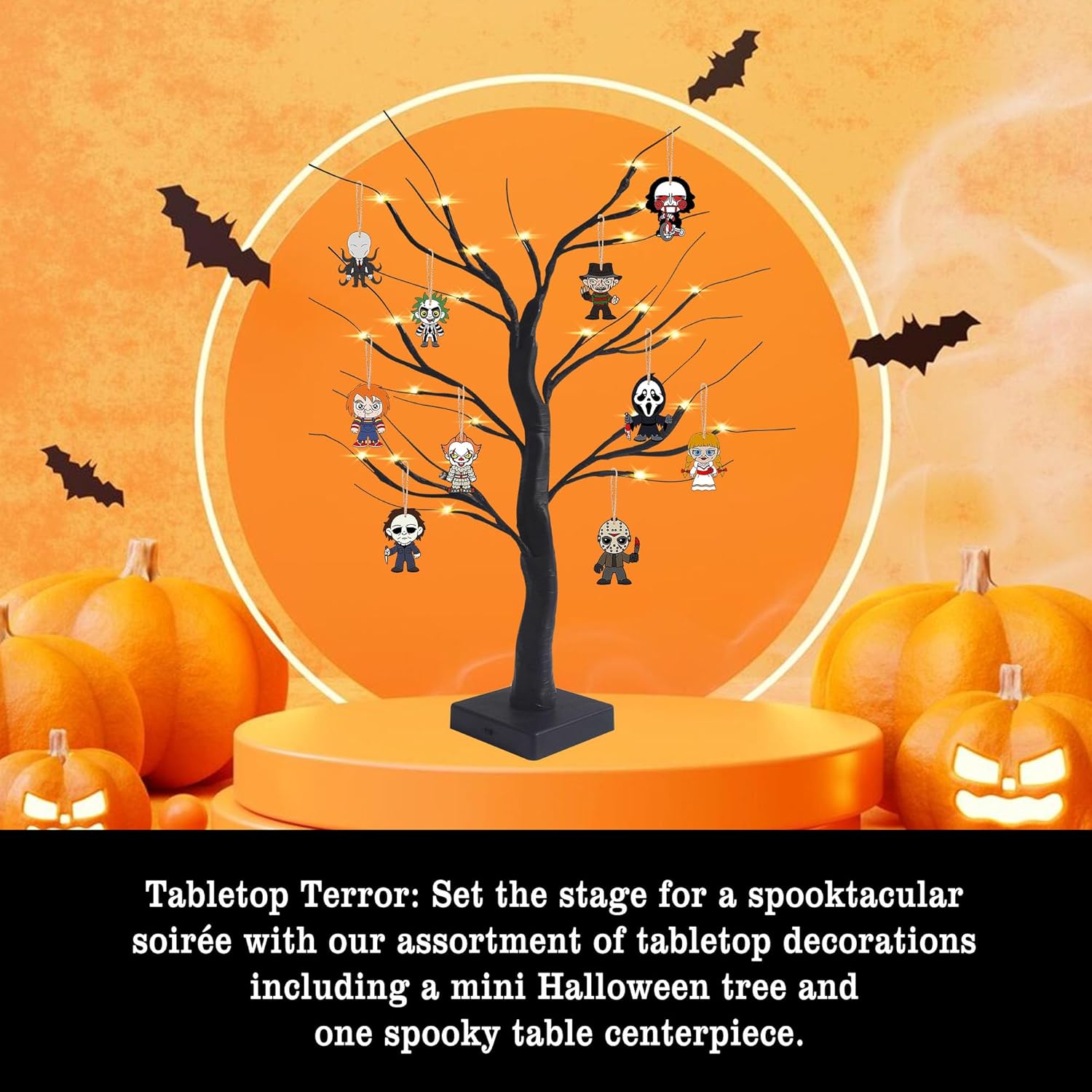 - Tabletop Terror: Set the stage for a spooktacular soirée with our assortment of tabletop decorations, including a mini Halloween tree and one spooky table centerpiece
