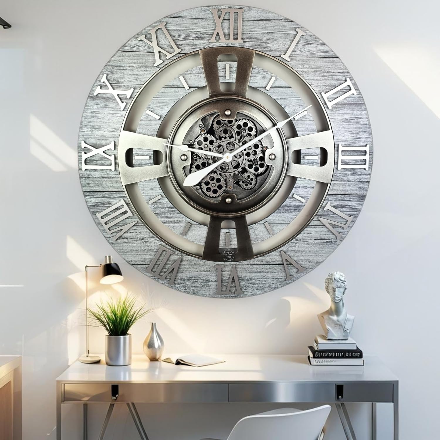 - MATERIAL QUALITY | The entire frame is made of Fir Wood, with embossed Silver Metal Numeral, and high Quality Plastic Silver with aged effect gears for vintage and industrial effect. Very Strong personality.