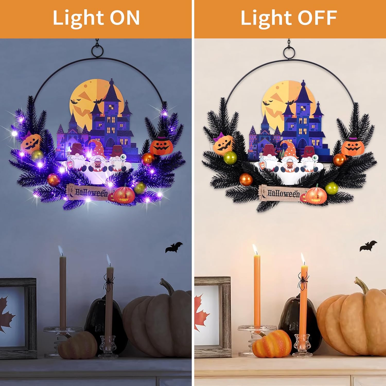 - Perfect Choice: This Halloween lighted wreath decorations that perfectly decorates front doors, walls, fireplaces and Windows to create a joyous and festive atmosphere is a great gift for friends and family who love Halloween, as well as adding a festive atmosphere to the home