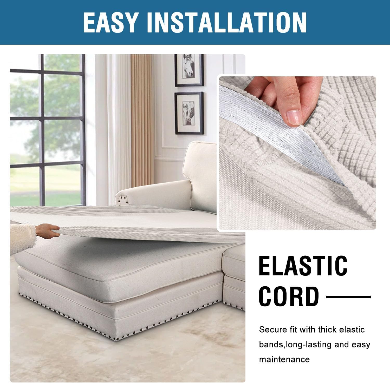 - NON SLIP: Effortless for installation (guide photos on selling page), sewn with thick elastic loops to cover the bottom edges. It is easy to install and take off, making your home more harmony, high recommended for both leather and cloth furniture