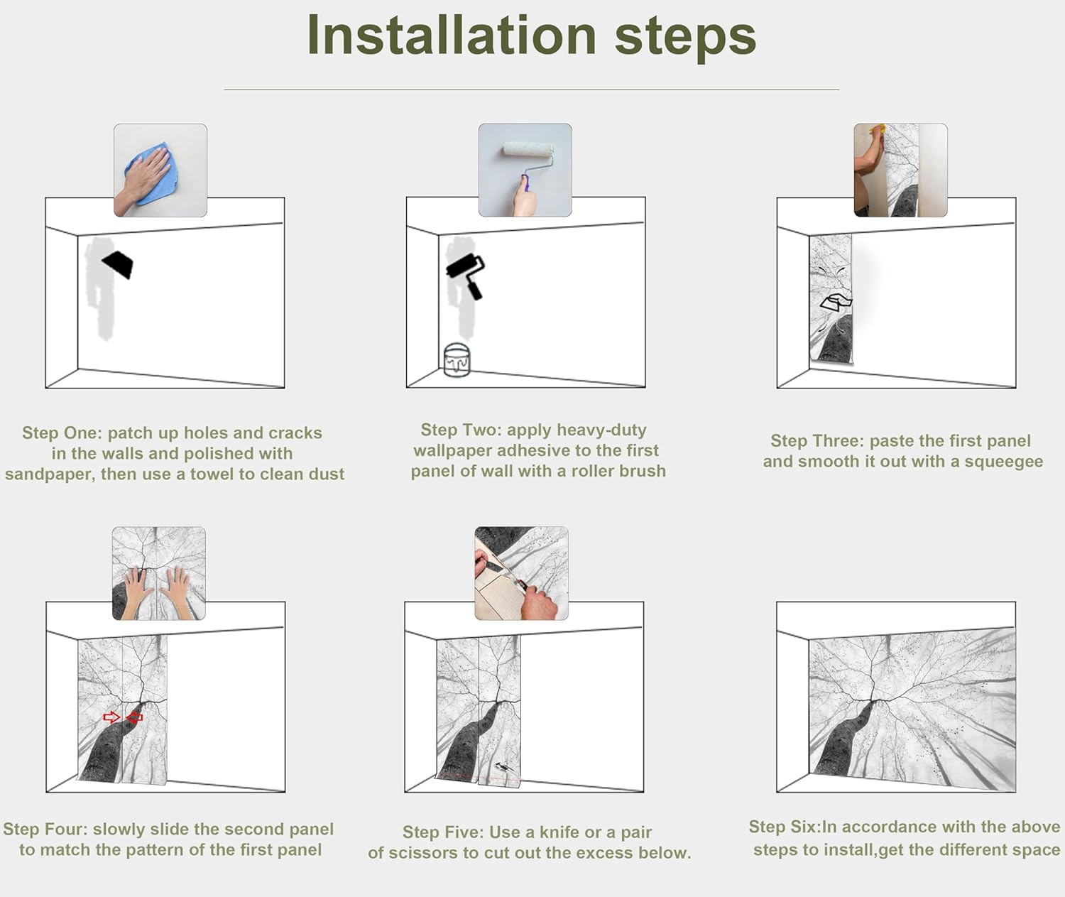 - INSTALLATION - 1.Fill in all cracks or holes and clean dust dirt and grease on the wall surface. 2. Apply the heavy duty wallpaper paste on the wall not mural. 3. Use a spirit level to mark first strip location. 4. match the pattern by sliding into place. 5.use a scraper to smooth out bubbles press. 6. Let dry for a few minutes and that's it! Please Note: Not self-adhesive. We recommend to use a standardized fleece wallpaper paste.