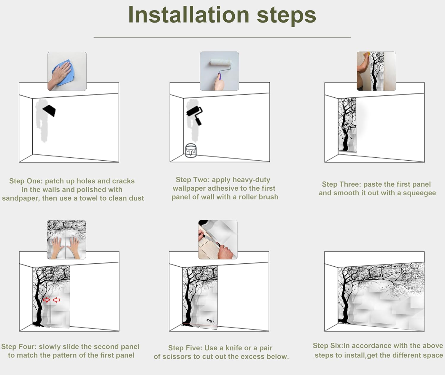 - INSTALLATION - 1.Fill in all cracks or holes and clean dust dirt and grease on the wall surface. 2. Apply the heavy duty wallpaper paste on the wall not mural. 3. Use a spirit level to mark first strip location. 4. match the pattern by sliding into place. 5.use a scraper to smooth out bubbles press. 6. Let dry for a few minutes and that's it! Please Note: Not self-adhesive. We recommend to use a standardized fleece wallpaper paste.