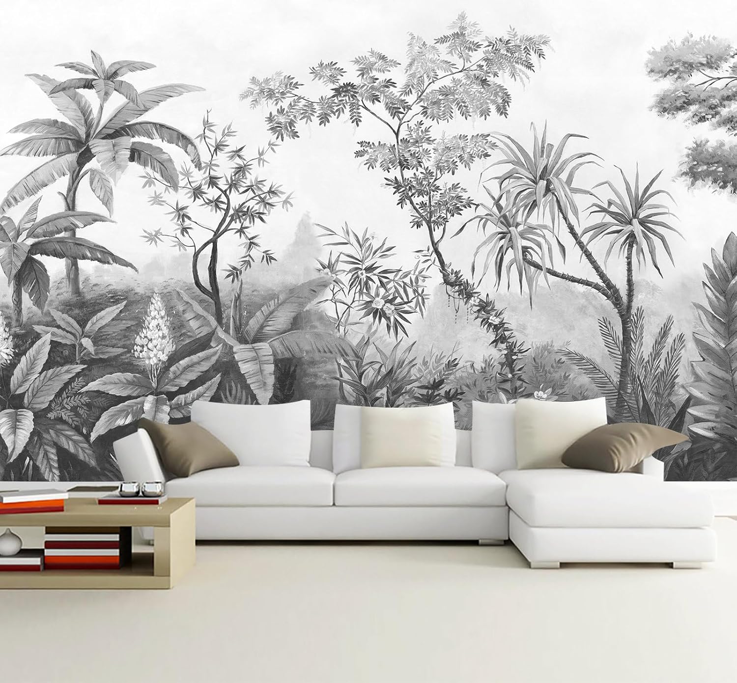 Gray Tropical Rainforest Botanical Wallpaper Bedroom Hand-Painted Oil Painting Jungle Plant Wall Mural Living Room (Not Peel and Stick)