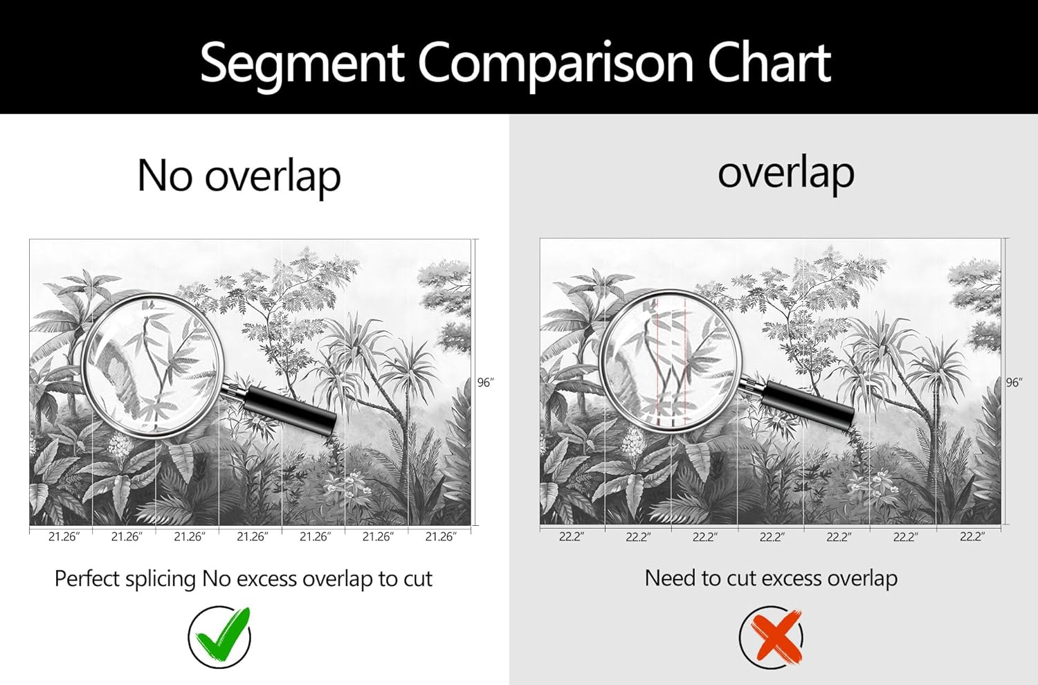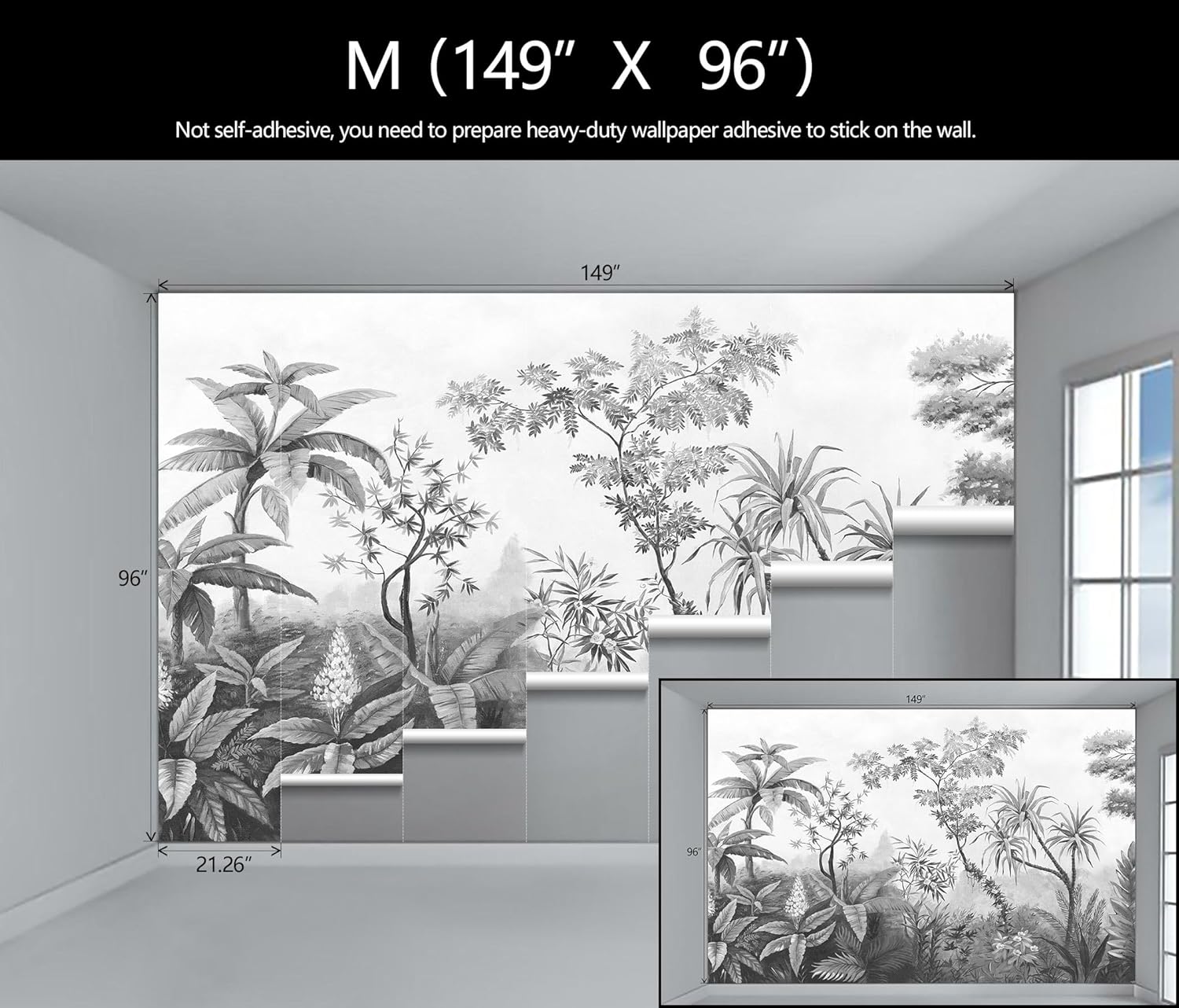 - Mural Size: The total size of this mural wallpaper is 149" x 96" / 378CM x 244CM (W x H), cut into 7 pieces, each measuring 21.26" x 96", for easy installation.