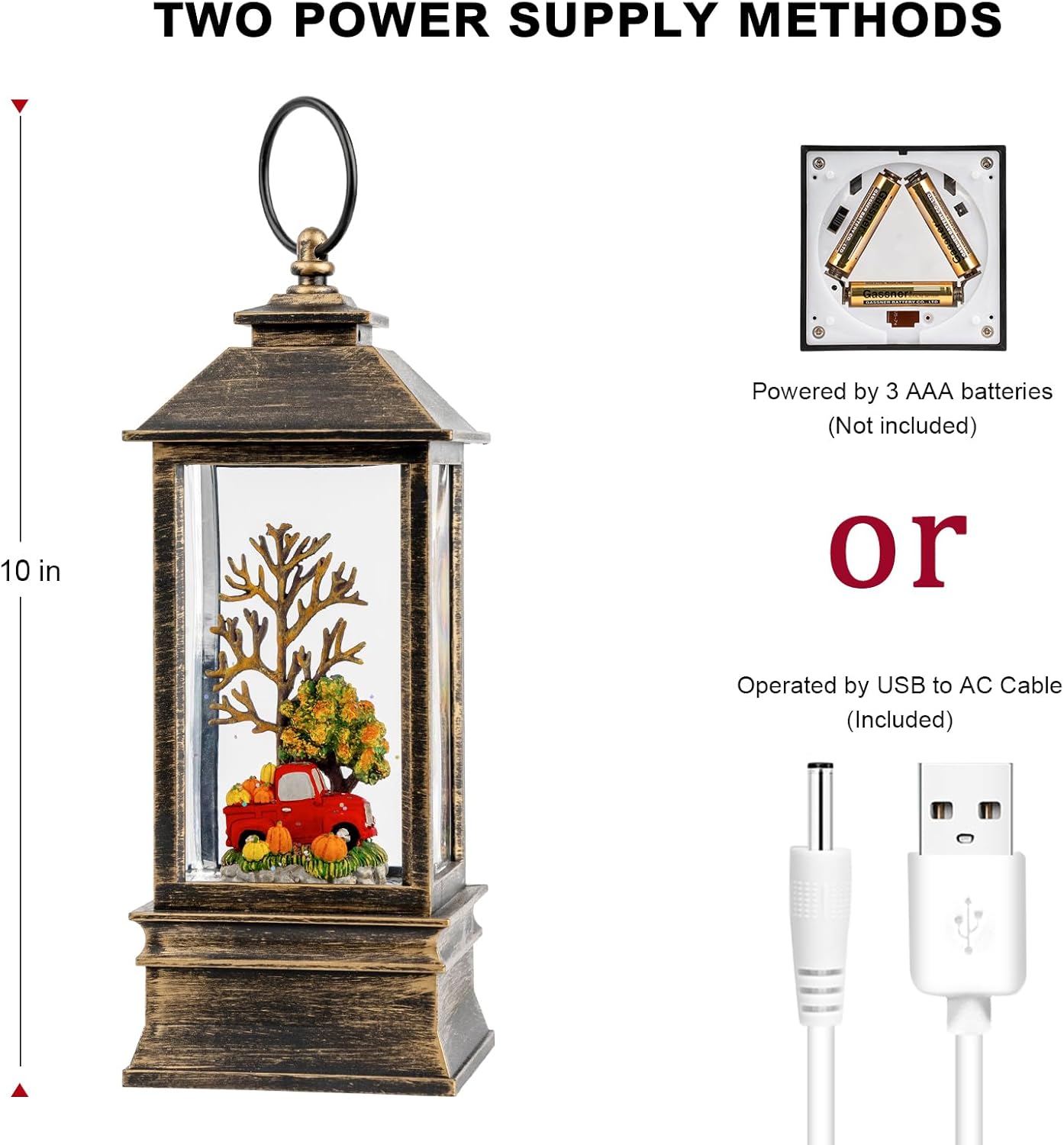 - 🍁【2 Mode Power Supply】Powered by USB to DC cable (include), the snow globe lantern can be operated without batteries, which can save you a lot on batteries. & Powered by 3 AA batteries (not included), you can place it at any place that you want to add warm ambiance.