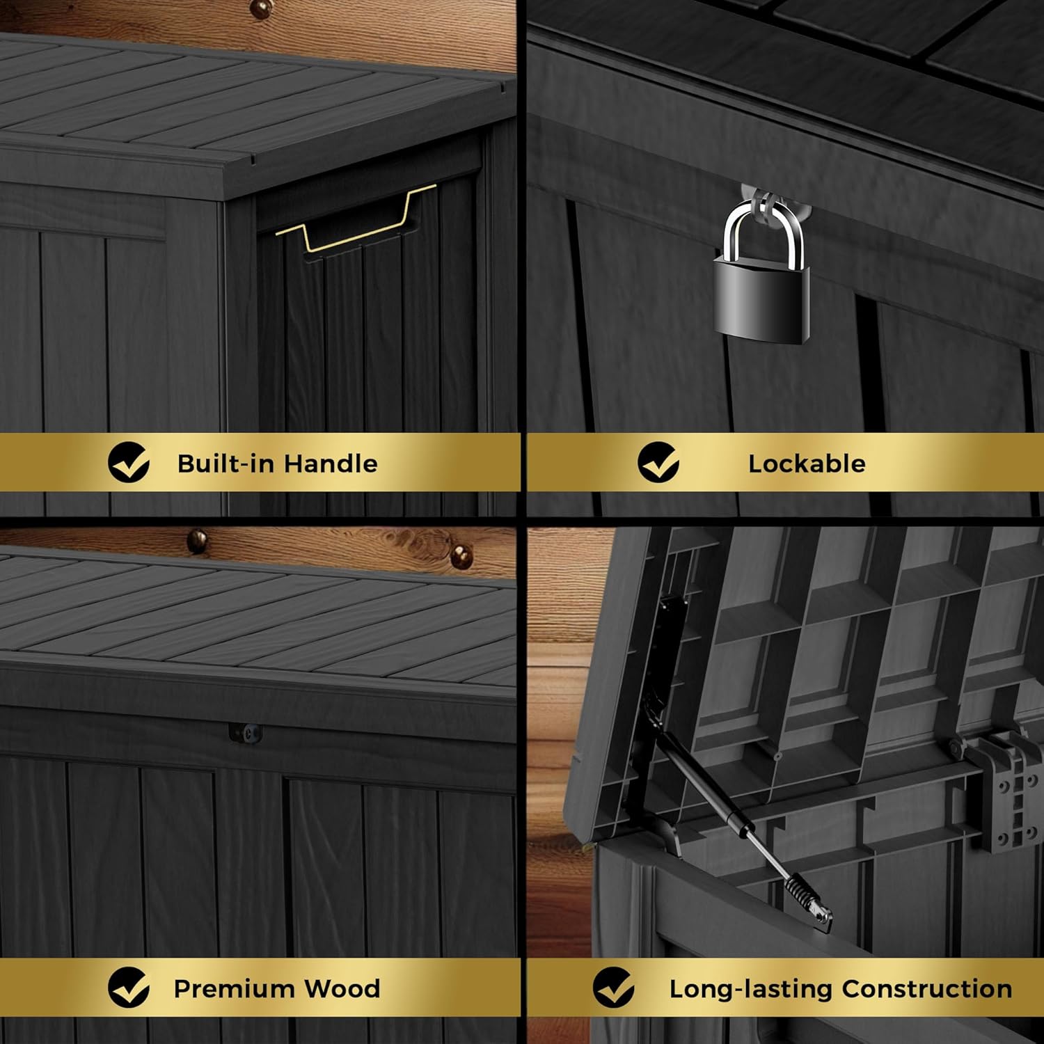 - Material: The patio outdoor storage box is made of the latest high-quality resin material, which makes this patio deck storage box waterproof, UV-resistant, anti-fading, and anti-bending protection, suitable for long-term outdoor use.