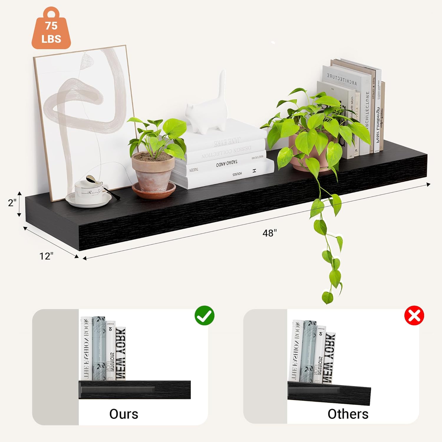 Heimlove 12 Inch Deep Floating Shelves, 48 x 12 inches Long Wall Shelf, Large Display Shelf & Storage Shelf, Rustic Wood Wall Shelves for Fireplace Mantel, Set of 1(Black)