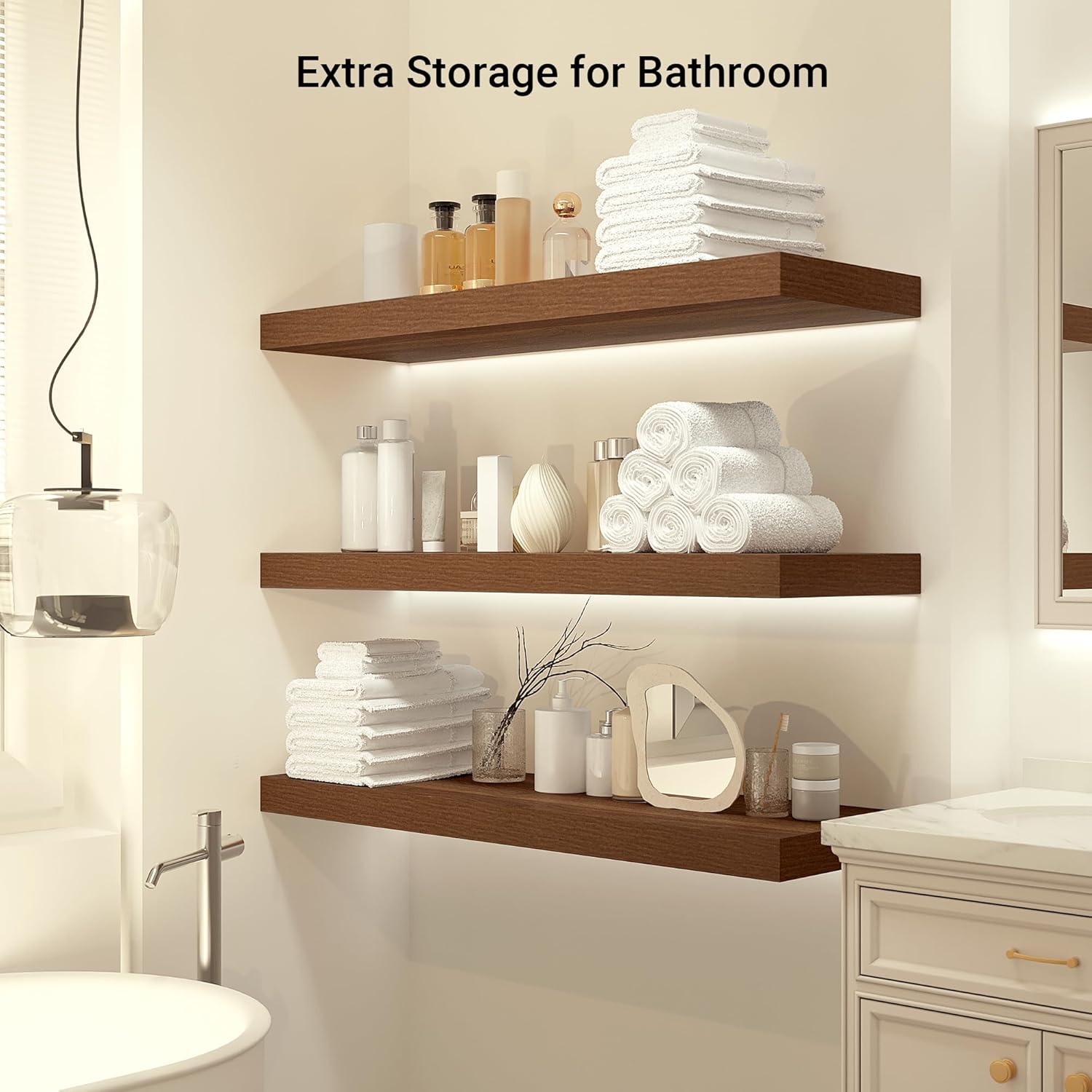 Heimlove 24 x 12 Inch Deep Floating Shelves Wall Mounted with Invisible Brackets,Storage Hanging Shelf for Wall Decor in Bathroom, Bedroom, Toilet, Kitchen, Living Room, Office Set of 1 (Walnut)