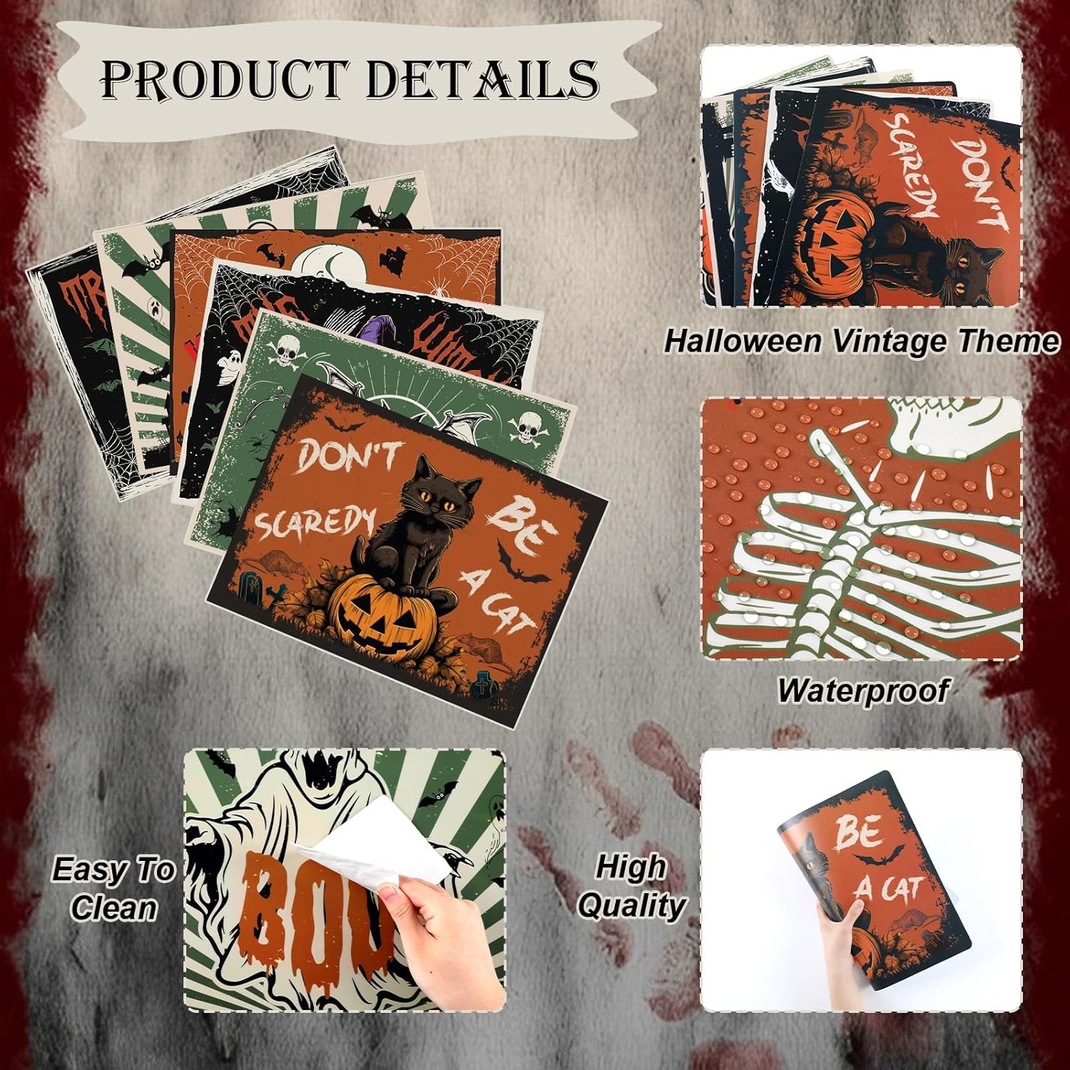 - Easy to clean: Vintage Halloween placemats plastic are easy to clean, does not fade and stain. Wash with a soft sponge or damp cloth and soapy water, and lay it flat or air dry. It is also convenient for you and save your time.