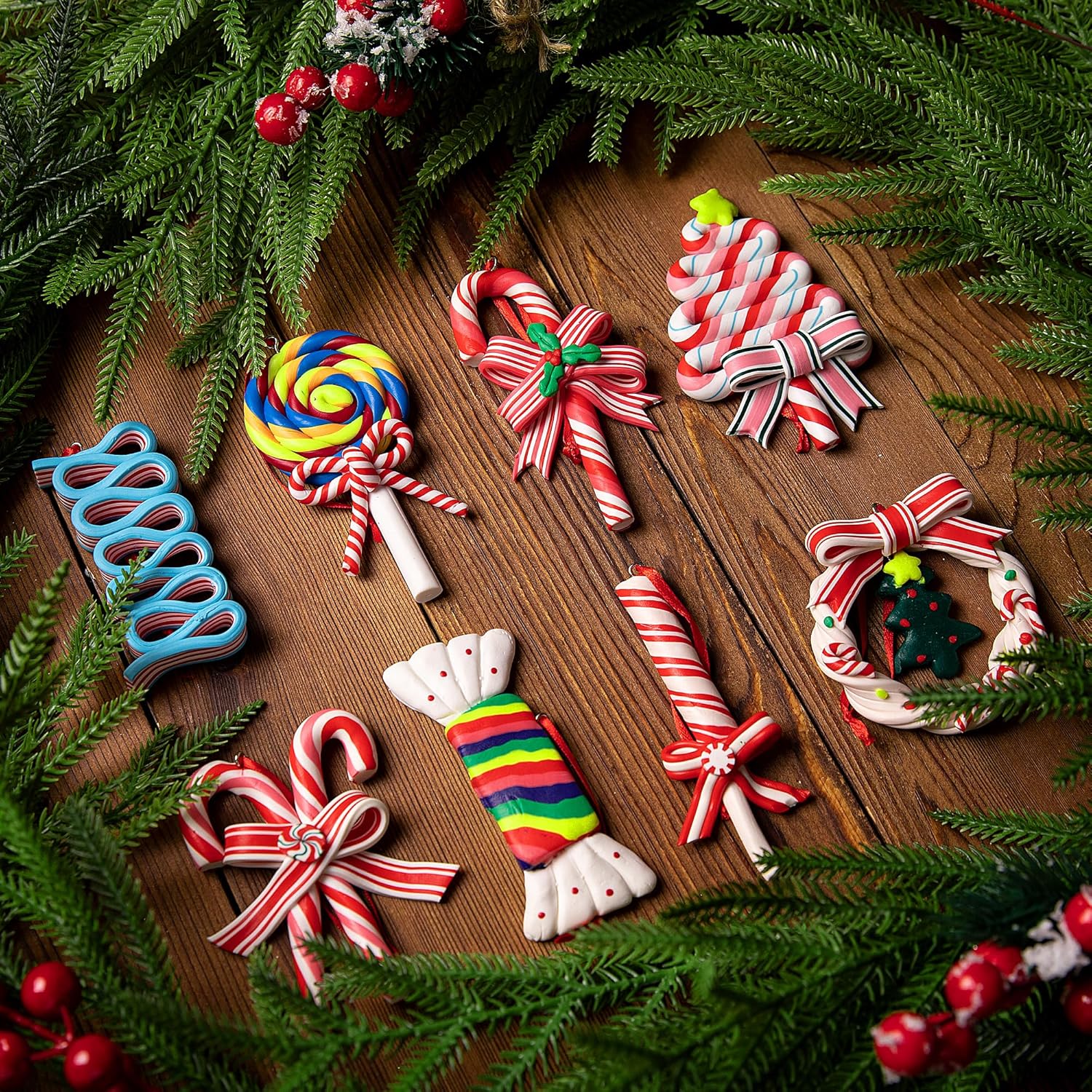 - Easy to use: Every Christmas lollipop polymer clay ornament is equipped with a red ribbon, lightweight, you can easily hang them where you want to decorate. Bring you a different visual experience.