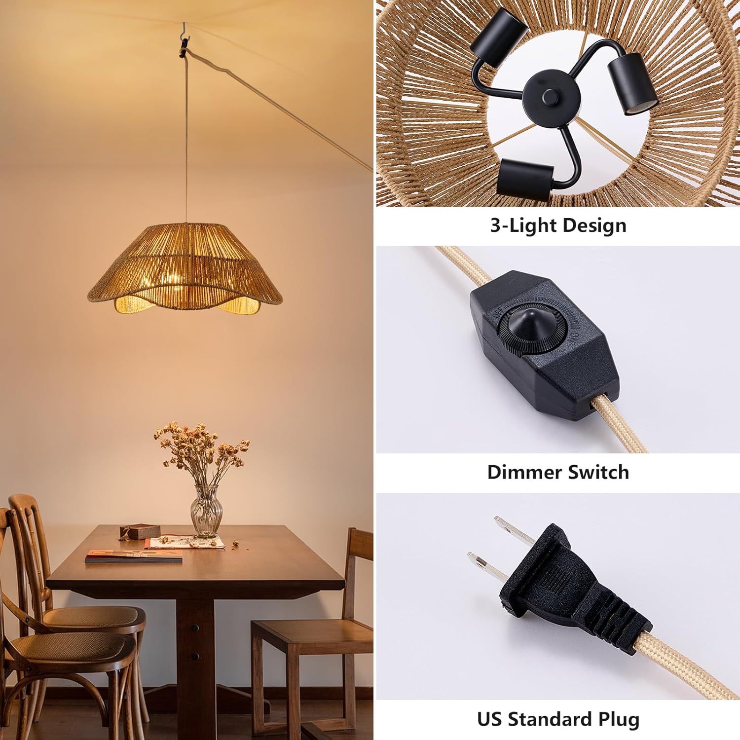 - 【Dimmer Switch】The rattan hanging lights with plug in cord features a dimmer button 4.9 ft from the plug that adjusts the brightness from 0% to 100% with a simple turn of the button, allowing you to easily control the plug in rattan pendant light without having to bend over.