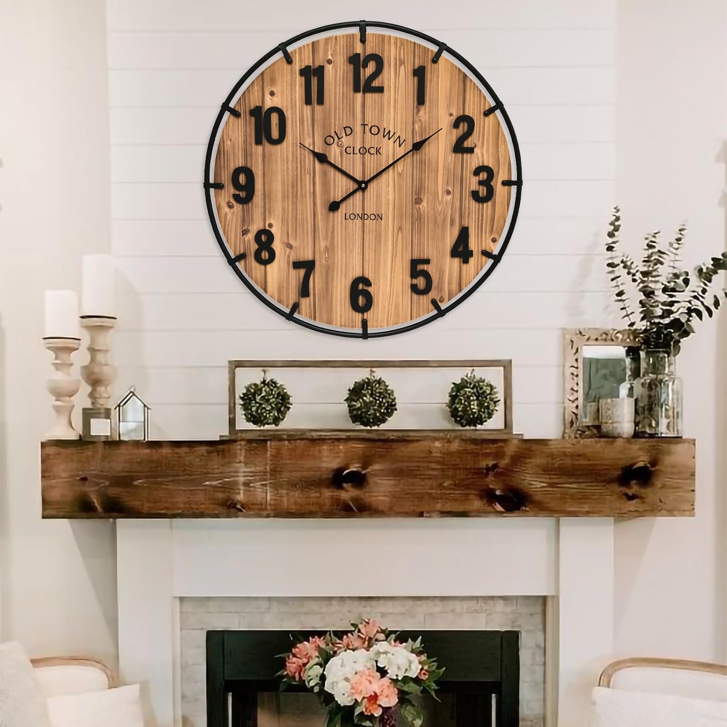 Large Old Town Farmhouse Wall Clock 20 Inches - Rustic Antique Wood with Metal Circle and Large Numerals Silent Battery Operated Wall Clock for Office Kitchen Bedroom Living Room