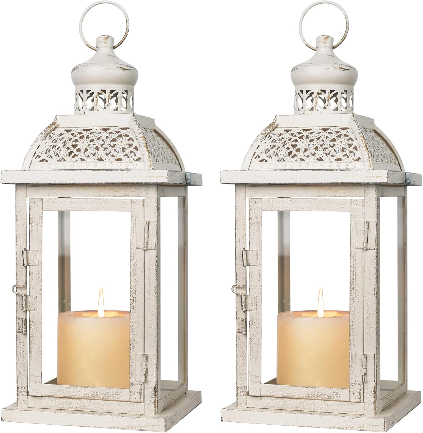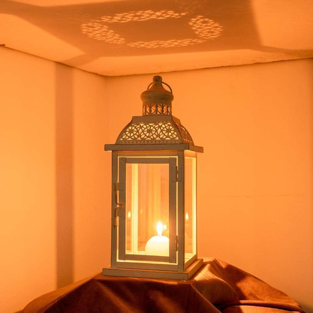 - 2 PACK CANDLE LANTERNS DECOR - DECORKEY large vintage candle lanterns create an aura of old-world charm. Adds a gorgeous touch and romantic ambiance to any space with the white square metal lantern having intricate cutouts that allow the light to flood through and create unique patterns. Decorate your patio, courtyard table or front porch with this elegant lantern for a cosy, classic homely feel.
