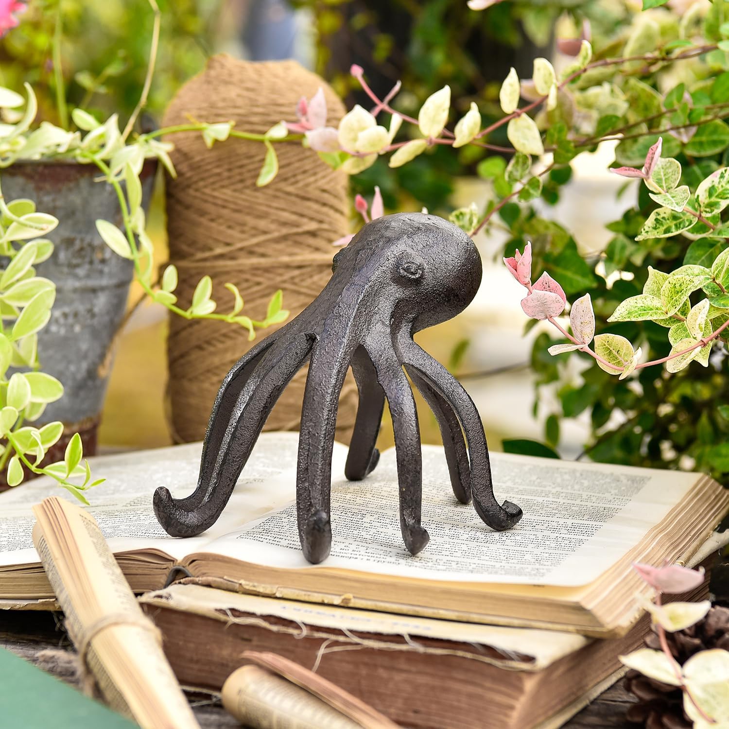 Sungmor Cast Iron Octopus Statue, Decorative Bookend, Cute Sculpture on Bookshelf or Desk, Creative Cell Phone Holder, Octopus Stand for Tablet, Black Brown