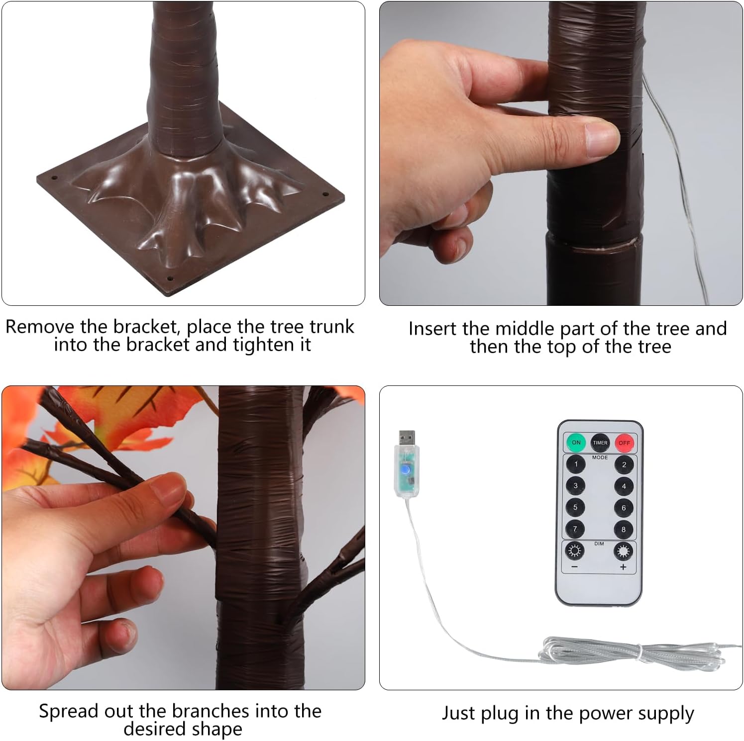 - 🍁【Packaging and Installation】Autumn tree decorations are made of plastic,copper wire and silk leaves. The lighted Fall Tree is IP44 waterproof (except base). There are four maple tree lights and four USB cables in each package. The base and trunk of the maple tree lamp can be disassembled, and the installation is also very simple, just connect the buckle of the trunk and the base.The branches of the lighted fall trees are wrapped in electrical tape to hide the wires and are safe to use. The hinged design of the square base combined with the metal trunk provides stability to the maple.can stay upright and not tilt easily.