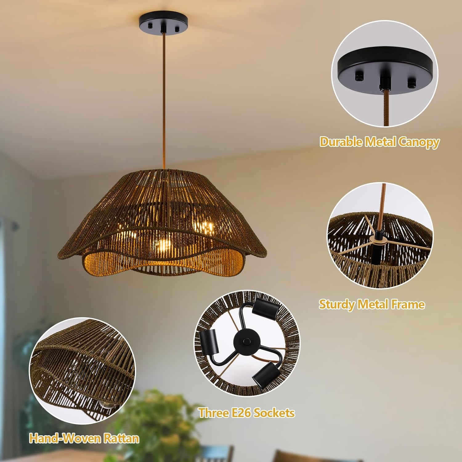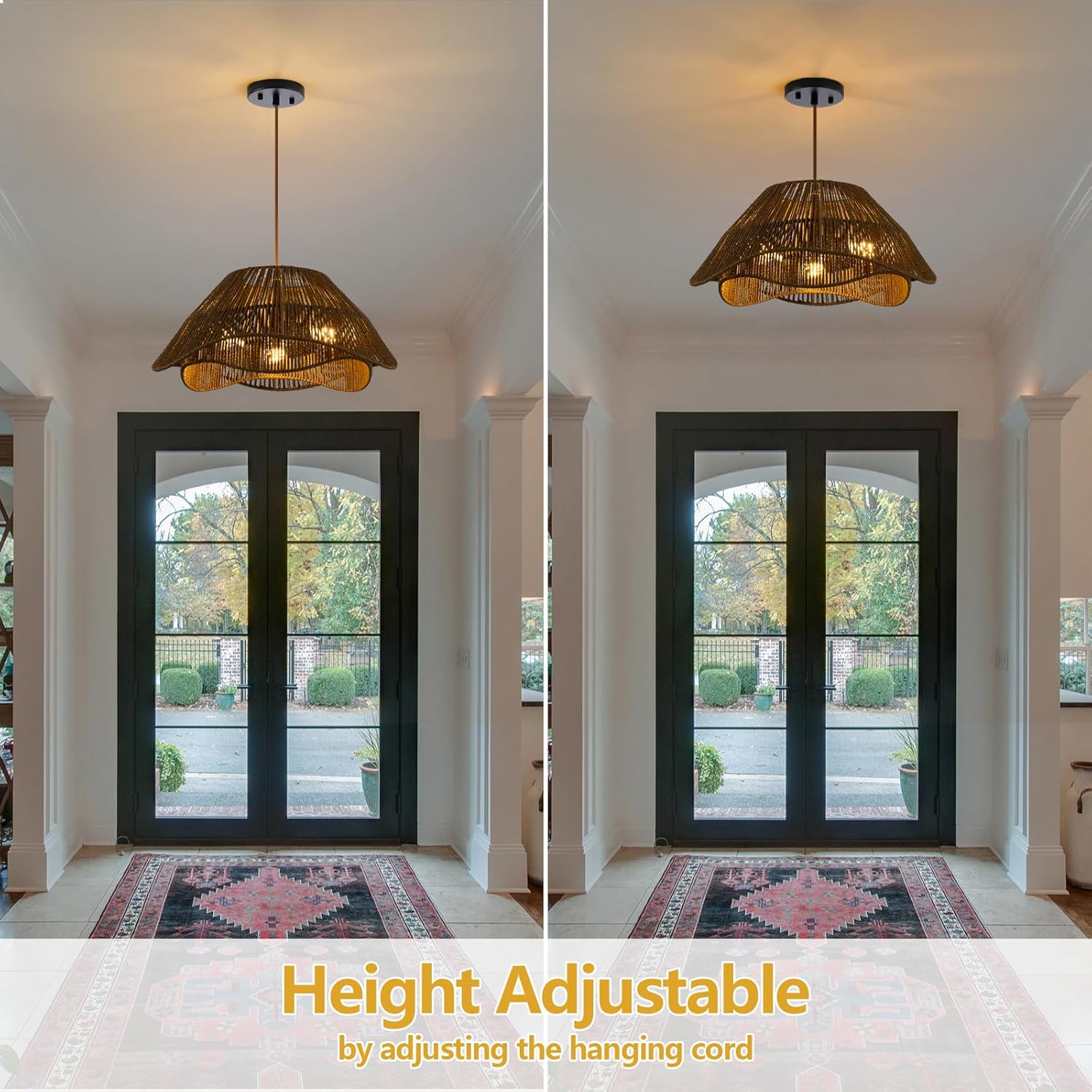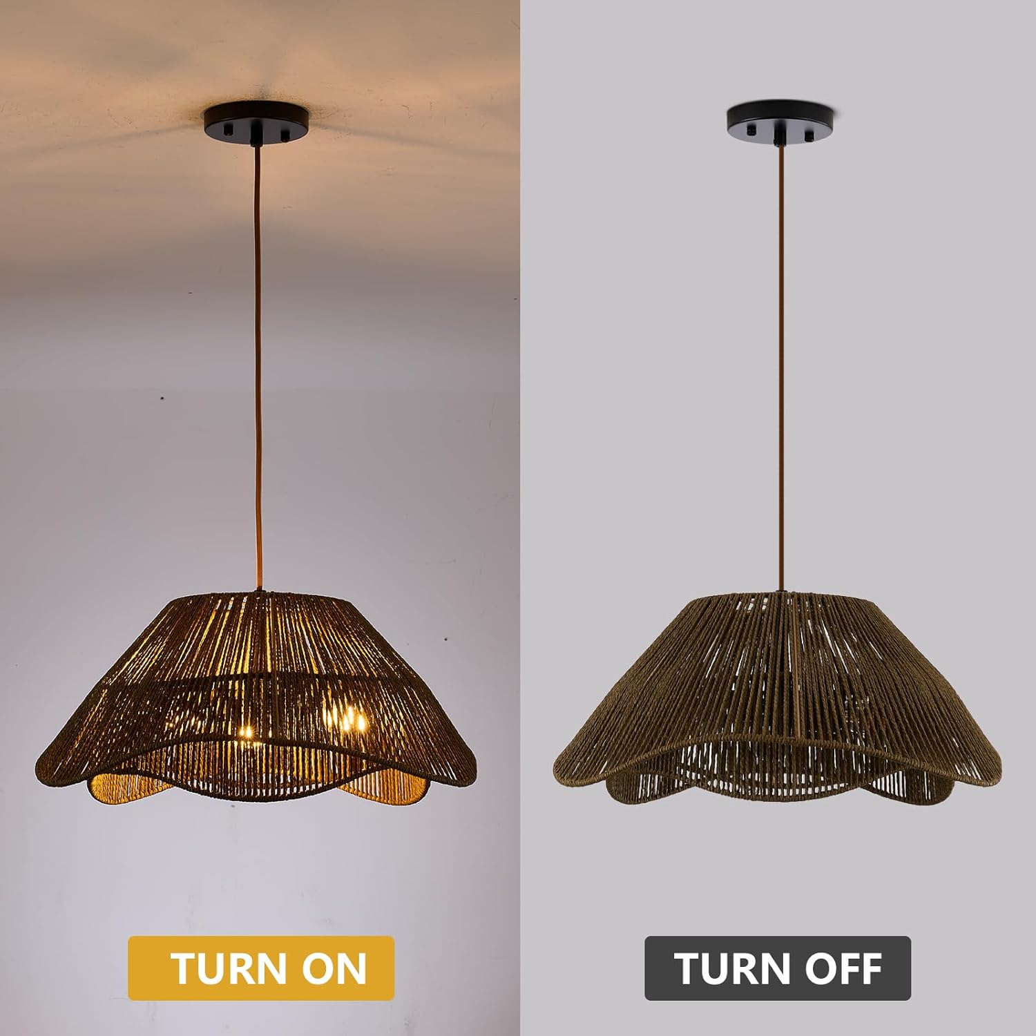 - 【Unique 2-layer Rattan Design】The boho pendant light fixture consists of a hand-woven antique rattan and a quality metal frame, bring a vintage boho style. Light through the double irregularly designed wicker shade to create a charming petal pattern on the ceiling, emits a inviting light and creates a warm and inviting vibe.