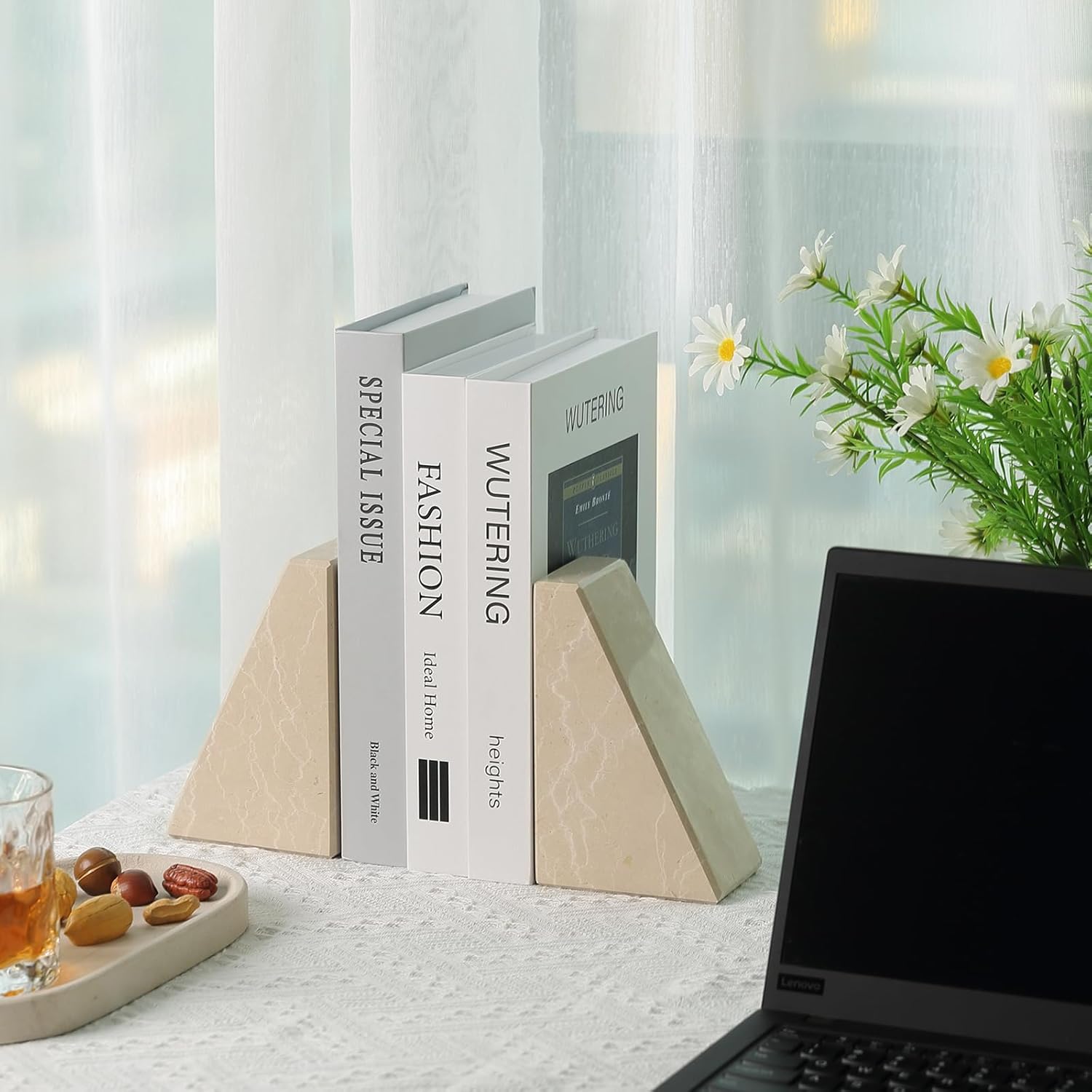 - MARBLE BOOKENDS: Delicate, flowing veins in soft beige and warm taupe tones create a dynamic yet harmonious visual appeal. This karibiber marble bookends for shelves will remain original form after a long time of use. The aesthetic marble book ends also maintains long-term stability.
