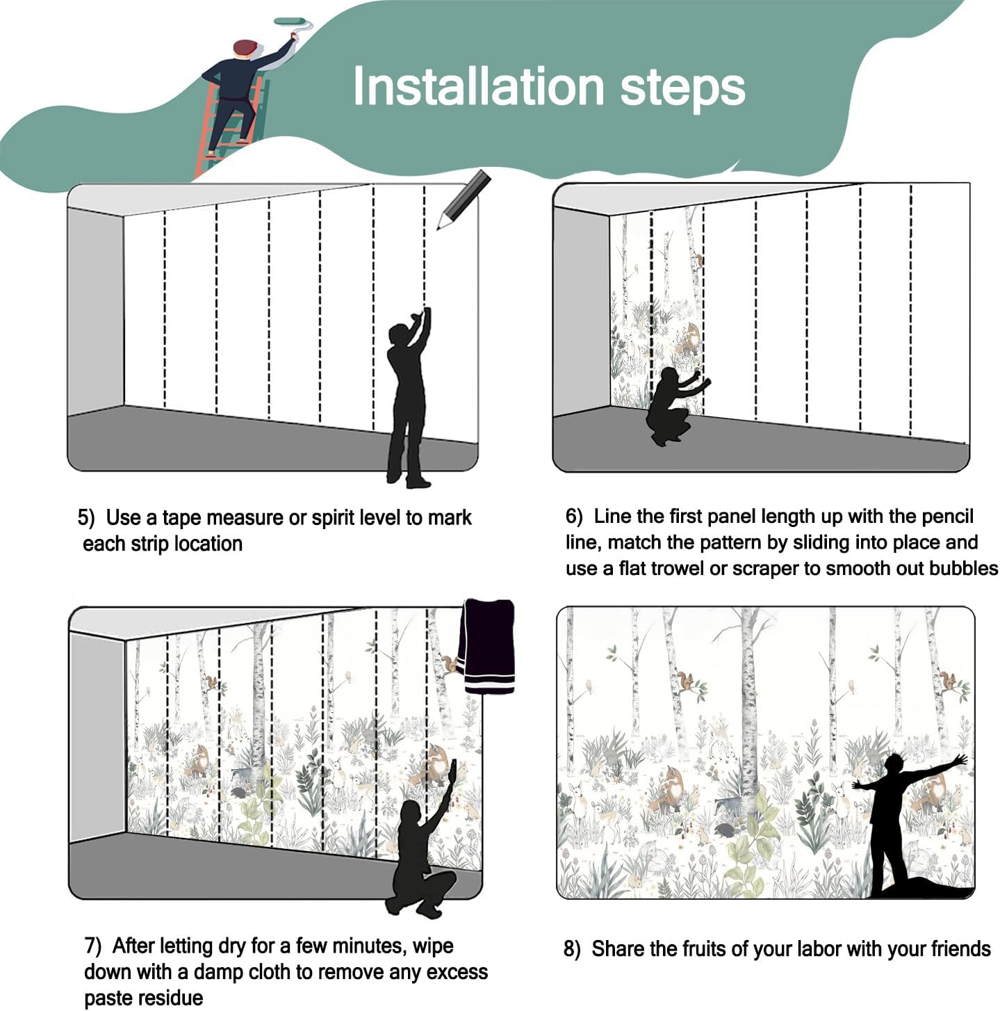 - Mural wallpaper size: 180 "W x 115 "H, divided into 9 sections, each section is labeled with a number underneath, there is no need to overlap the pattern when installing, just install according to the number labeled underneath the panel