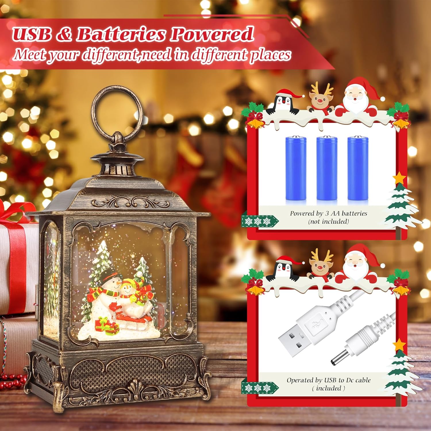 - USB & Battery Powered:Christmas Snow Globe Lantern that can be powered by USB cable (included) or 3 AA batteries (not included). The rotating water glitter lantern creates a festive atmosphere with snowy scenes and warm lights.