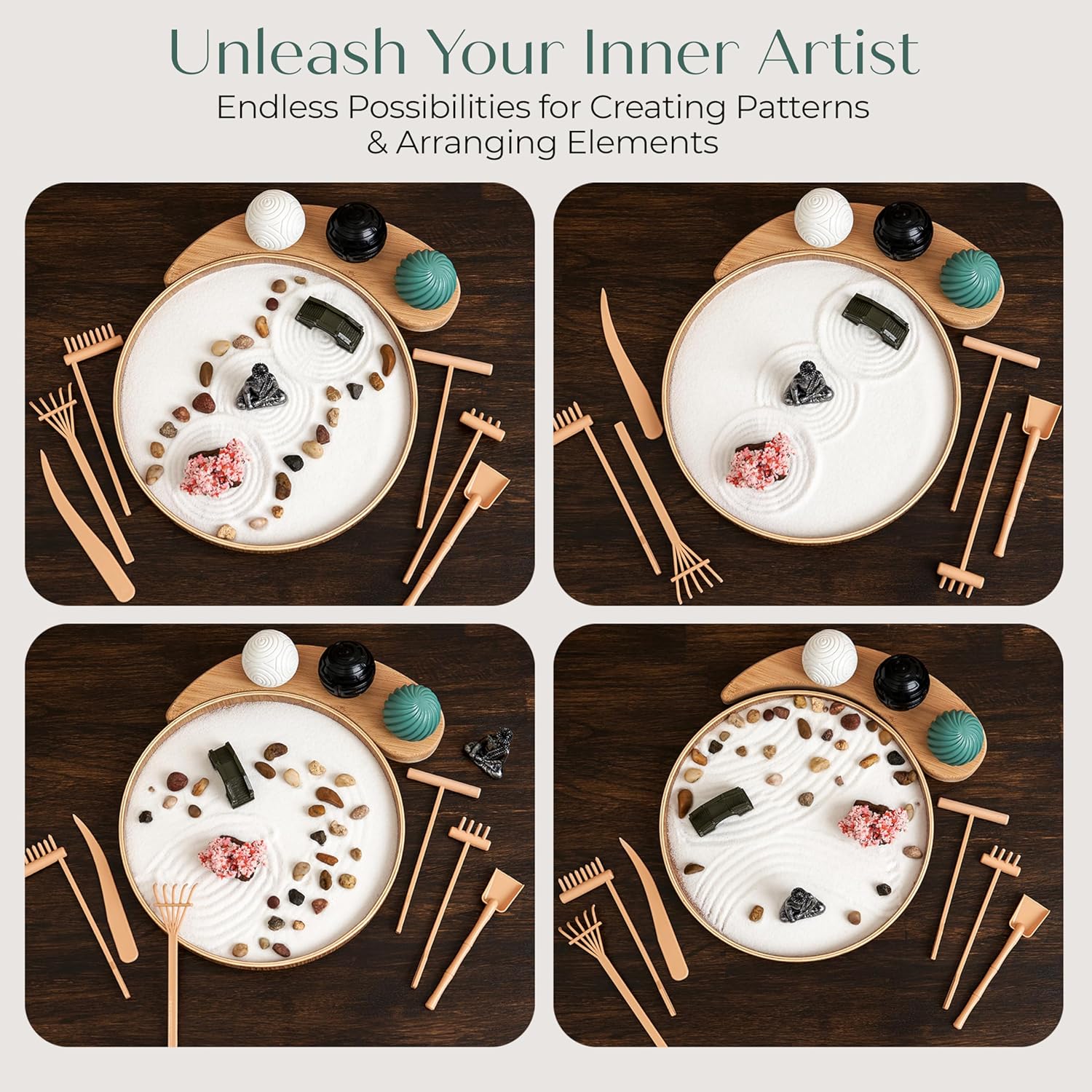 - UNLEASH YOUR INNER ARTIST: Design intricate patterns, arrange polished stones, and roll the sand balls in the Japanese sand garden to create mesmerizing landscapes in this decorative sand garden for desk. With miniature resin rakes and versatile tools, this kit inspires you to create beautiful art and provides limitless opportunities to express yourself while achieving a state of calm and mindfulness.