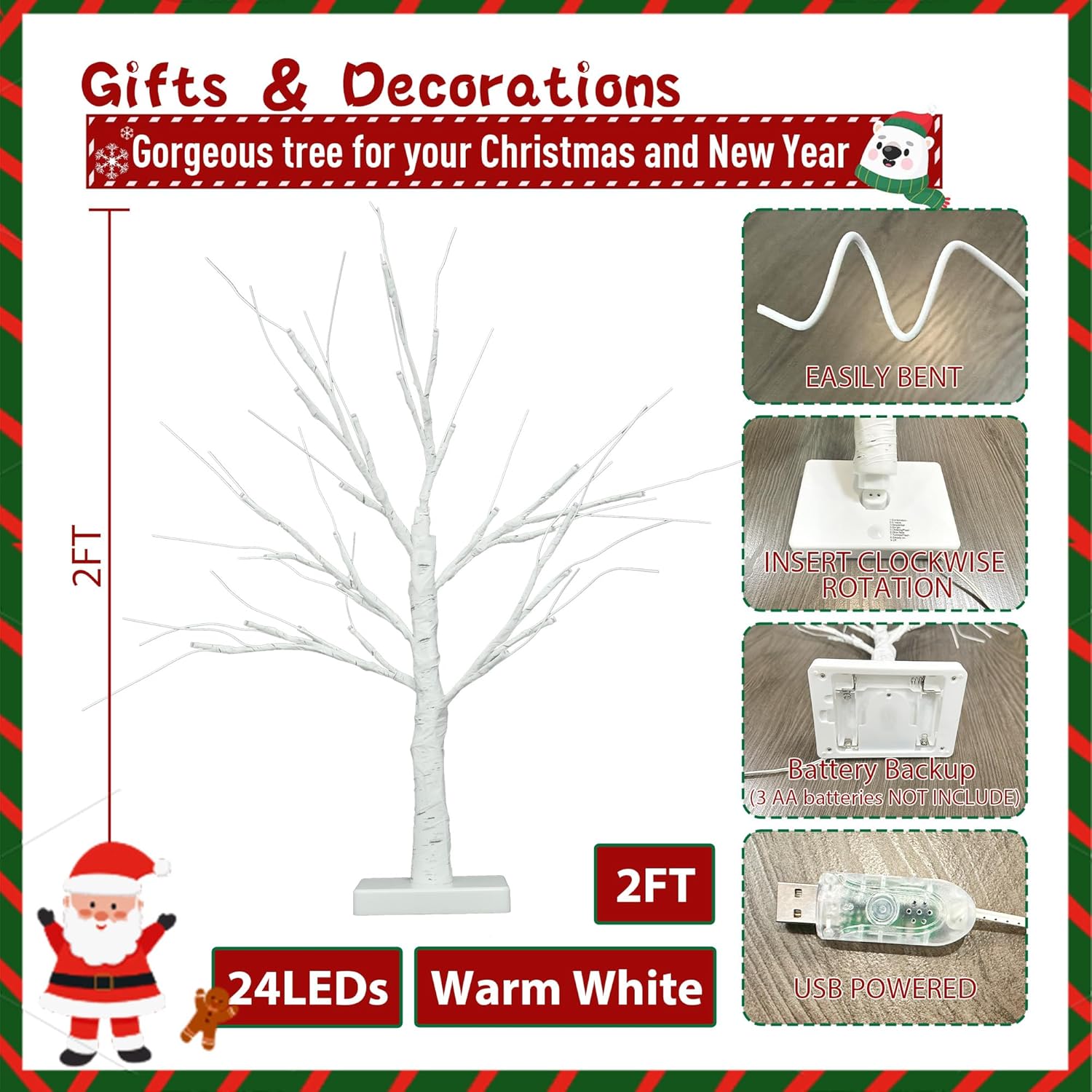 - ROOM DECOR: Overall height of 2 FT with a 4 Inch square base and 24 warm white lights; The tree trunk and branches are wrapped in birch bark looking tape which is attractive and beautiful