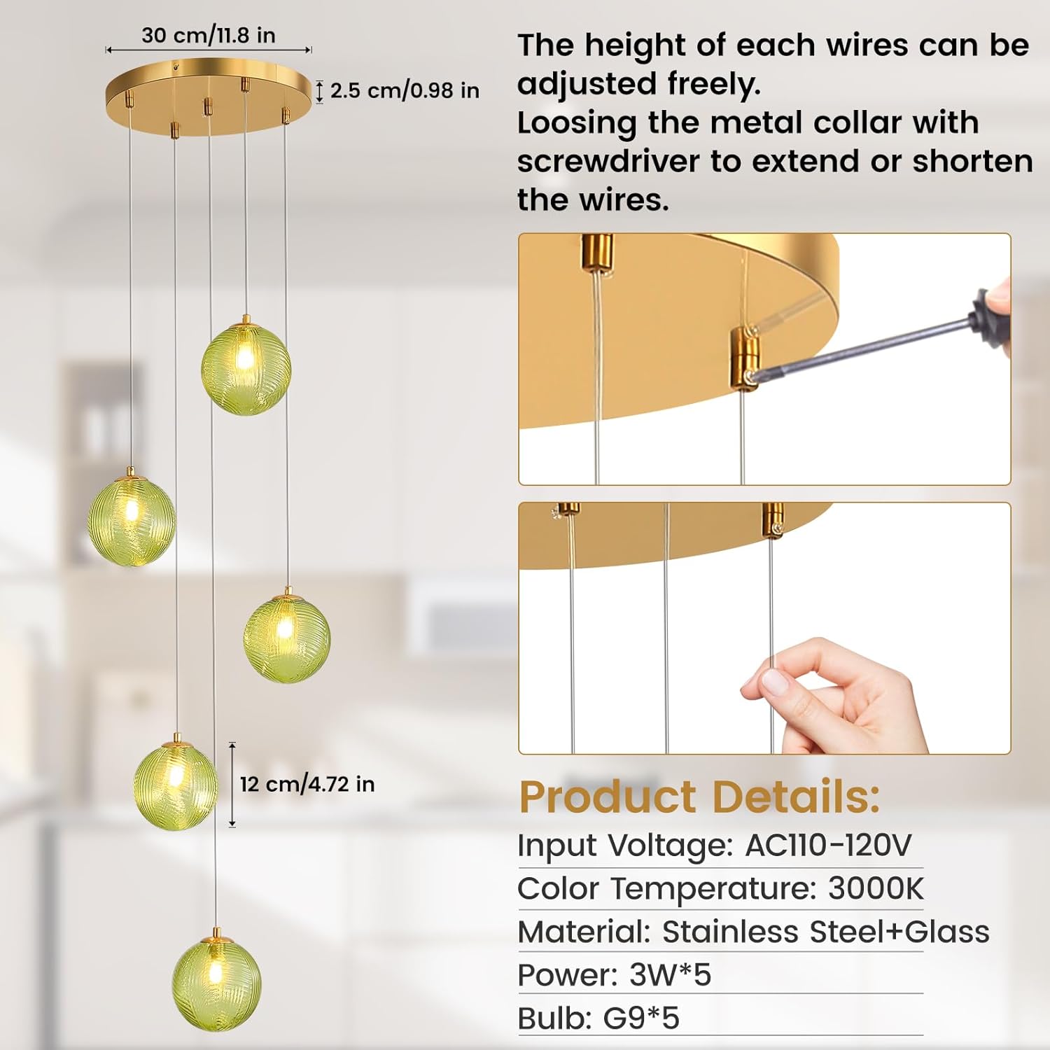 - Light Source: It comes with 5 G9 LED bulbs that emit 3000K warm light. With a voltage range of 110 - 240V, it is suitable for use in a variety of electrical environments.This 5-light cluster pendant lights stairwell lighting itself is not dimmable, but it can be dimmable when work with dimmable bulb and dimmable switch.