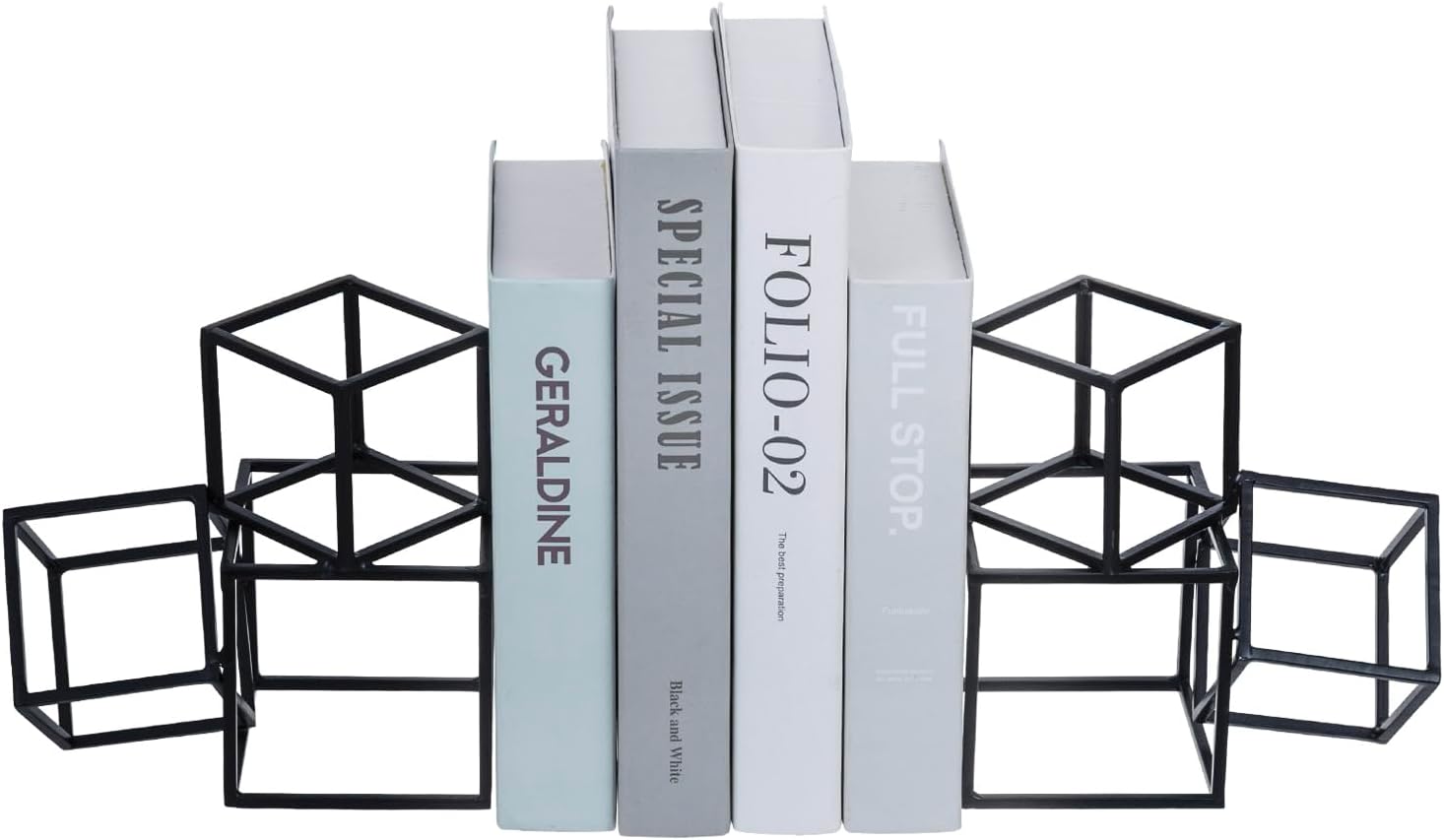 - Geometric structure with interconnecting open cube shapes adds a 3D sculpture art element to these stands, blending modern decor with functional book support