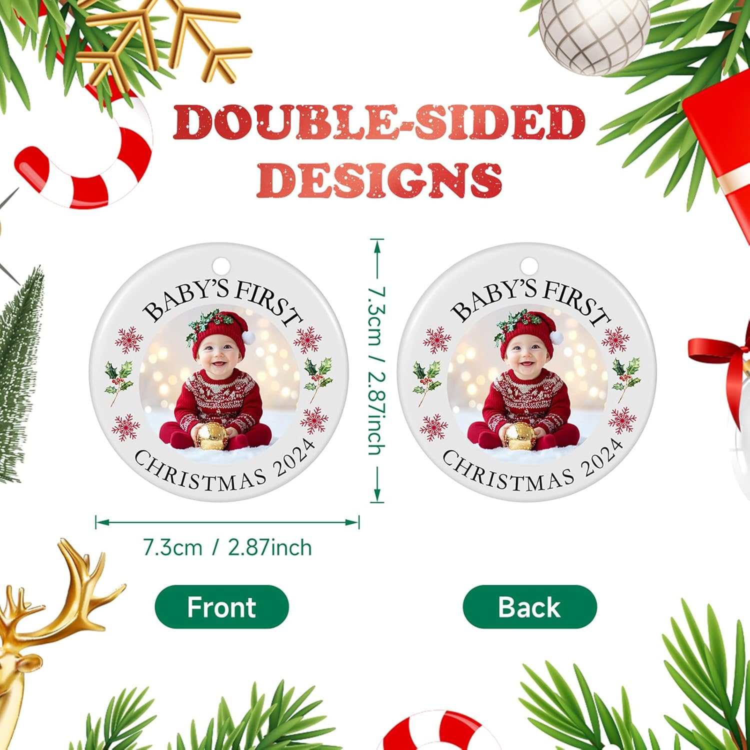 - PREMIUM QUALITY CERAMIC:Crafted from high-quality ceramic, this baby's first Christmas ornament is built to last as a cherished keepsake. Featuring double-sided printing with durable, waterproof, and wear-resistant inks, it adds an elegant touch to your holiday decor, preserving lasting memories of your special moments.