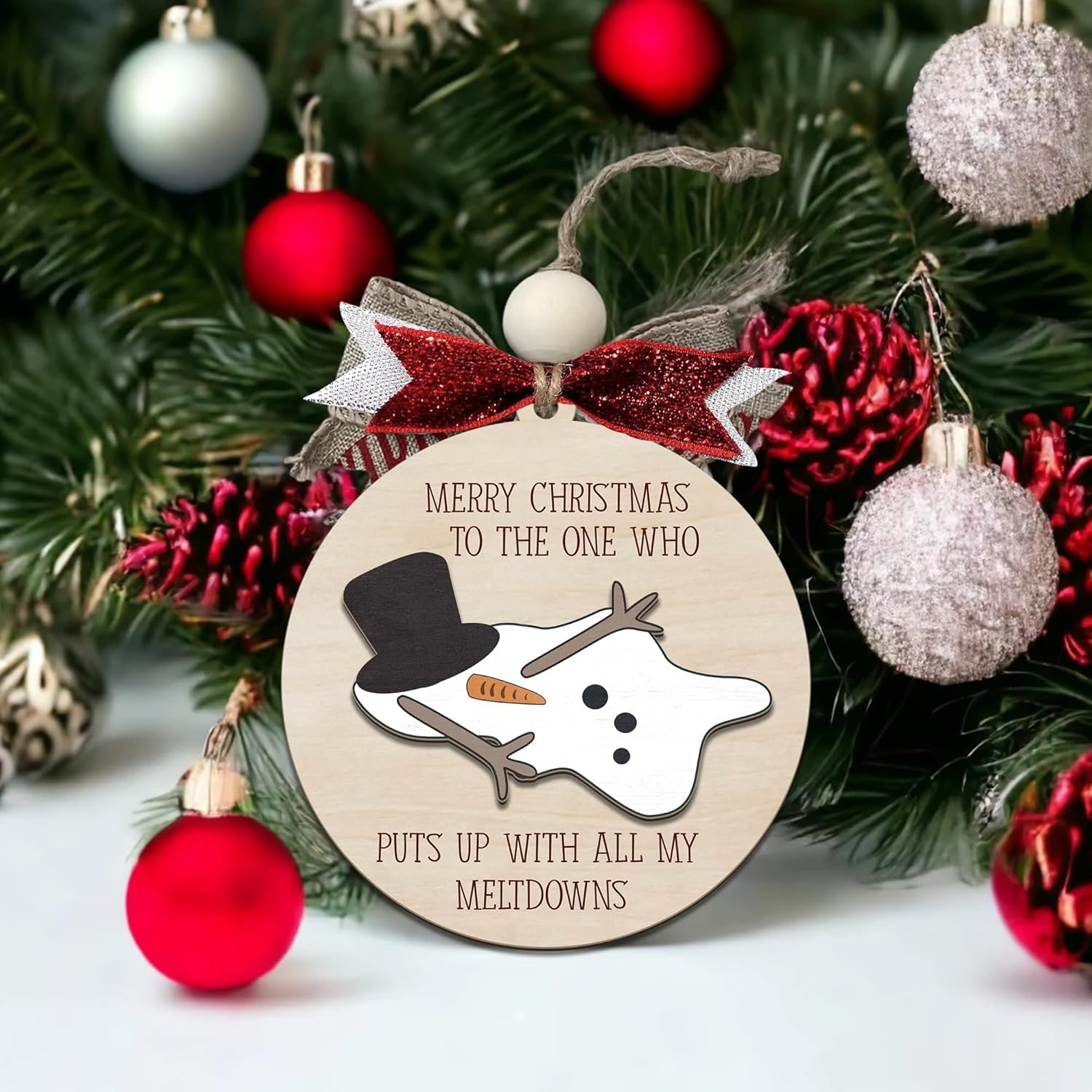 - ☃️ Cute melted snowman design — Features a playful snowman puddle and the message “Merry Christmas to the one who puts up with all my meltdowns”; a sweet, light-hearted snowman funny ornament that brings smiles to the tree.