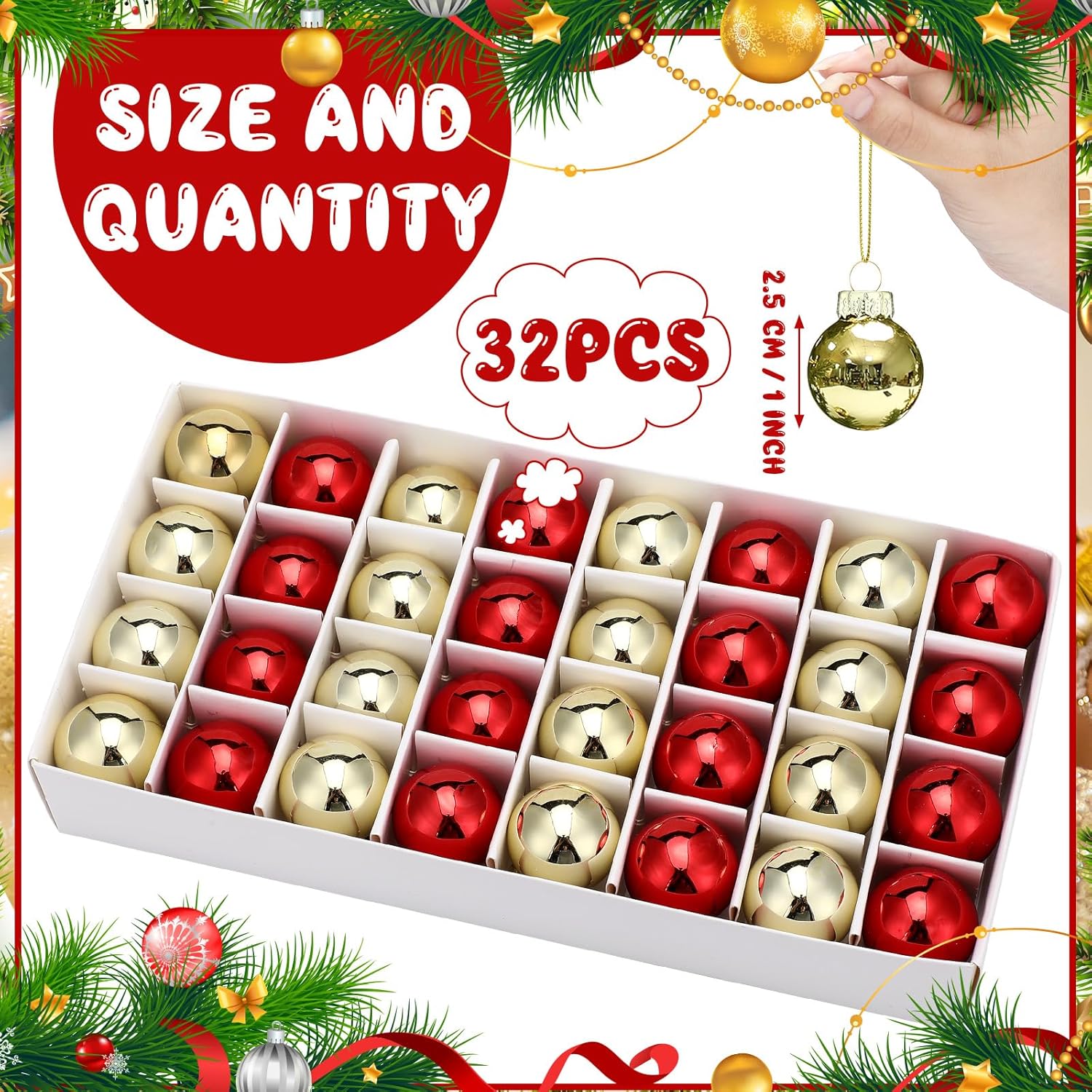 - Complete Festive Package: in each package of the mini Christmas tree ornaments, you will receive a total of 32 pieces, each measuring about 1 inch/ 2.5 cm in diameter; These are plentiful enough to sufficiently adorn your tree and enhance your holiday decorations, catering to most of your festive needs