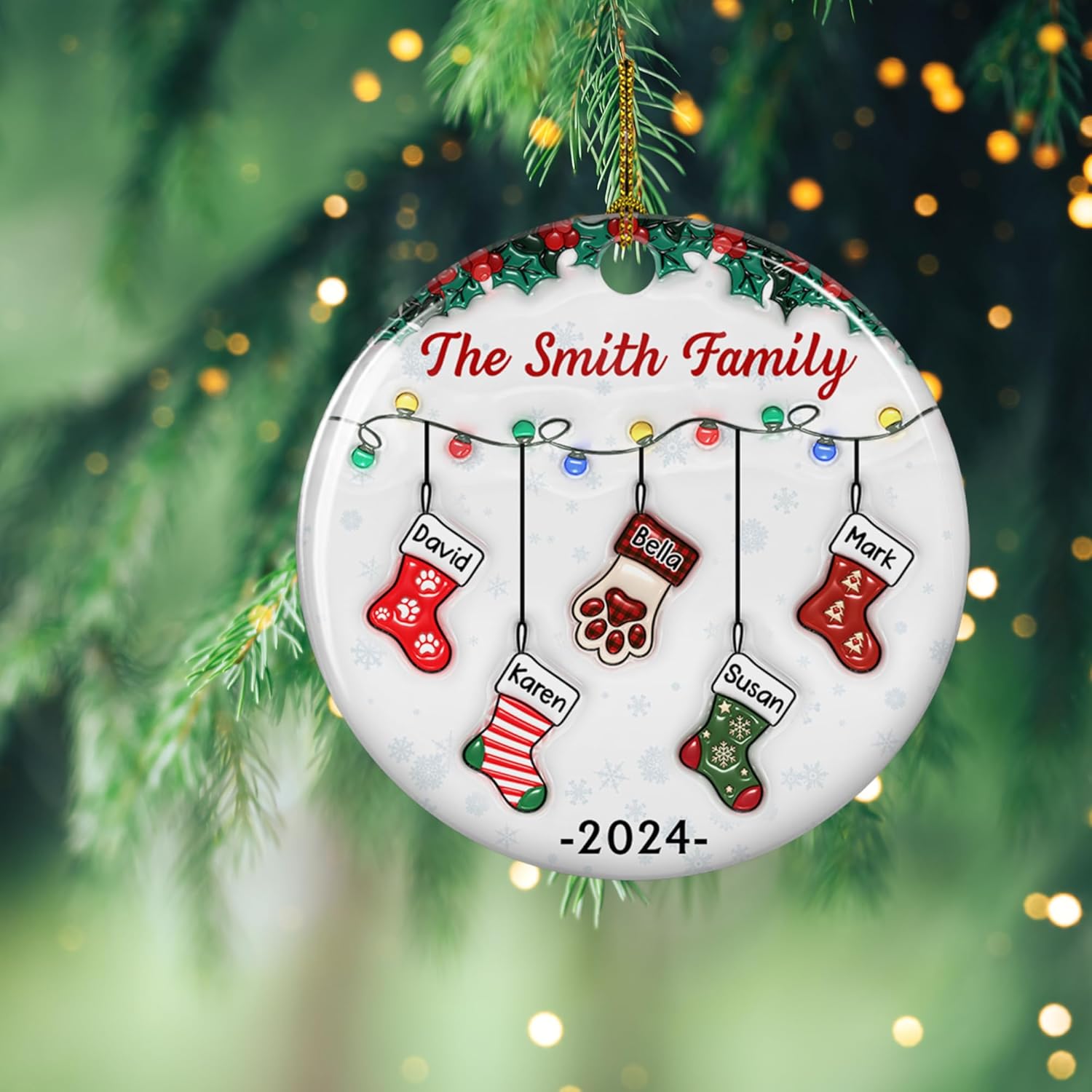 - π Personalized Stocking Design β Celebrate your family's togetherness with this customizable ceramic ornament. Add up to 10 names, representing each family member with their own festive stocking, making it the perfect way to commemorate Christmas 2024.