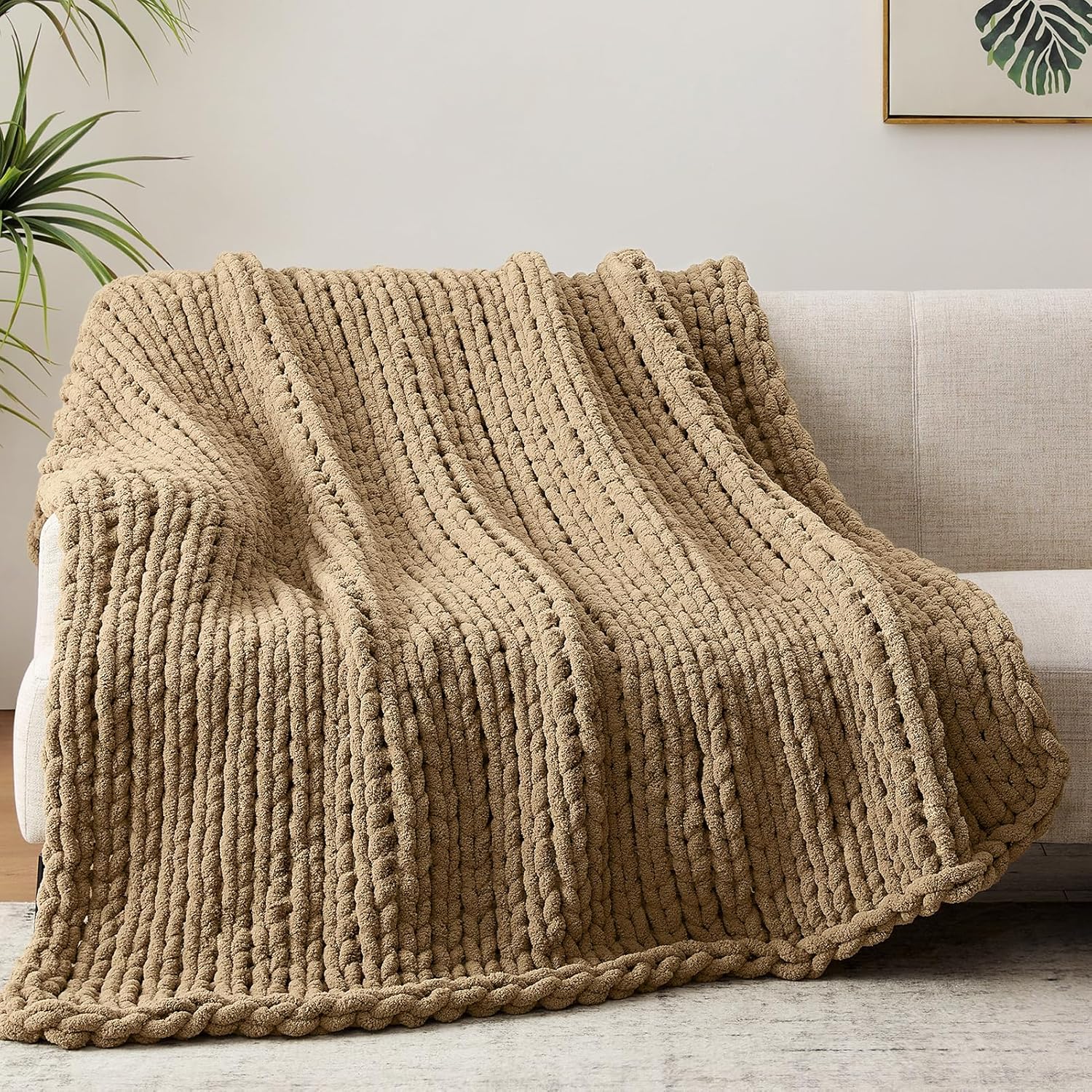 Chunky Knit Throw Blanket, 40''*50'' Knitted Throw Chenille Yarn for Bed Couch, Handmade Light Brown Crochet Big Thick Blanket, Machine Washable Cute Comfy Blanket for Home Decor