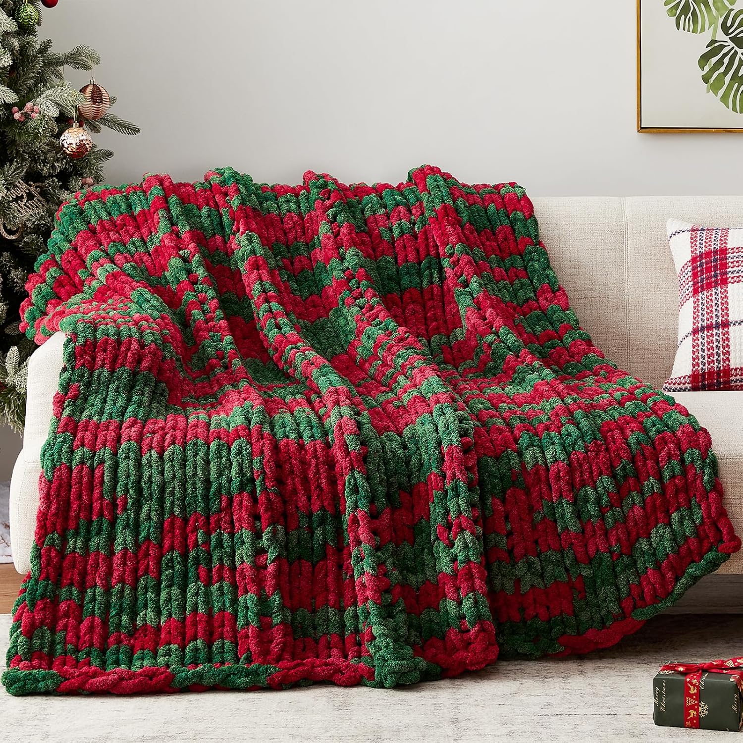 Chunky Knit Throw Blanket, 40''*50'' Knitted Throw Chenille Yarn for Bed Couch, Handmade Stripe Crochet Big Thick Blanket, Machine Washable Cute Comfy Blanket for Home Decor