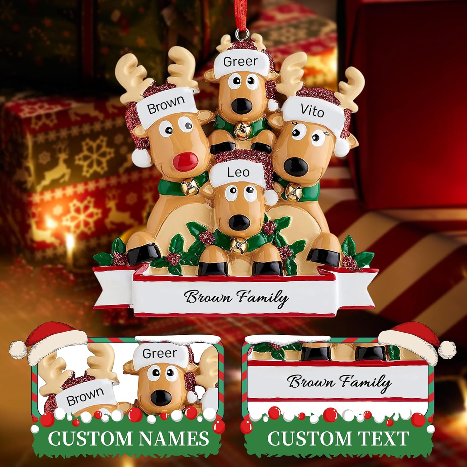 - 🎄Family Name Christmas Ornaments: Celebrate your closest bonds with custom ornaments for Christmas trees designed for families of 2-8. Our charming reindeer add heartfelt warmth to your holiday décor, turning your tree into a visual tribute to those who make the season special.