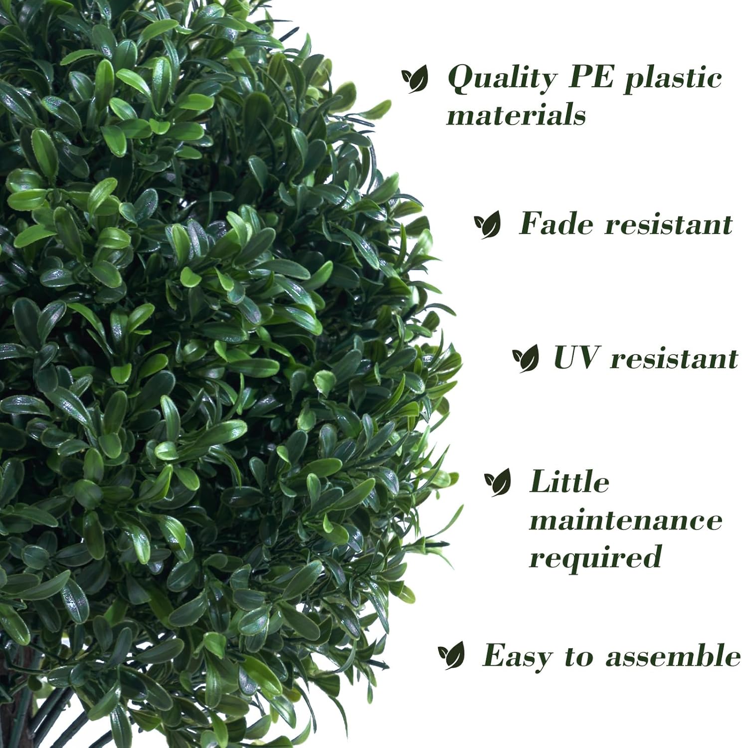 - 【EXCELLENT QUALITY】 The 2 pack of artificial boxwood topiary ball bushes with spikes for outdoor & indoor are made from premium material, designed to be UV resistant, waterproof, and fade proof. Size:22"H x 15"D x 15"W (Including the 4.7 inch height spikes). We have enhanced the density of the leaves making them look more lifelike and lush. The surface of the branches also has features realistic textures