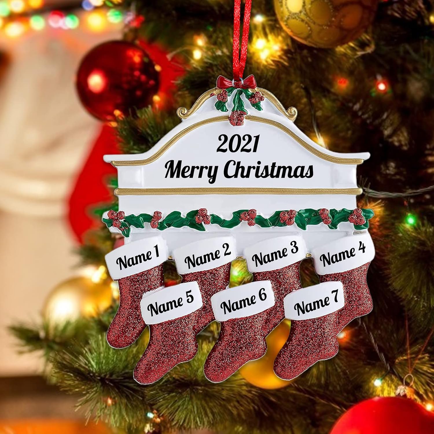 - Durable Ceramic Material: Personalized red stocking family of 2-8 Christmas ornaments.Made of light-textured ceramic material with red glitter, it eye-catching existence