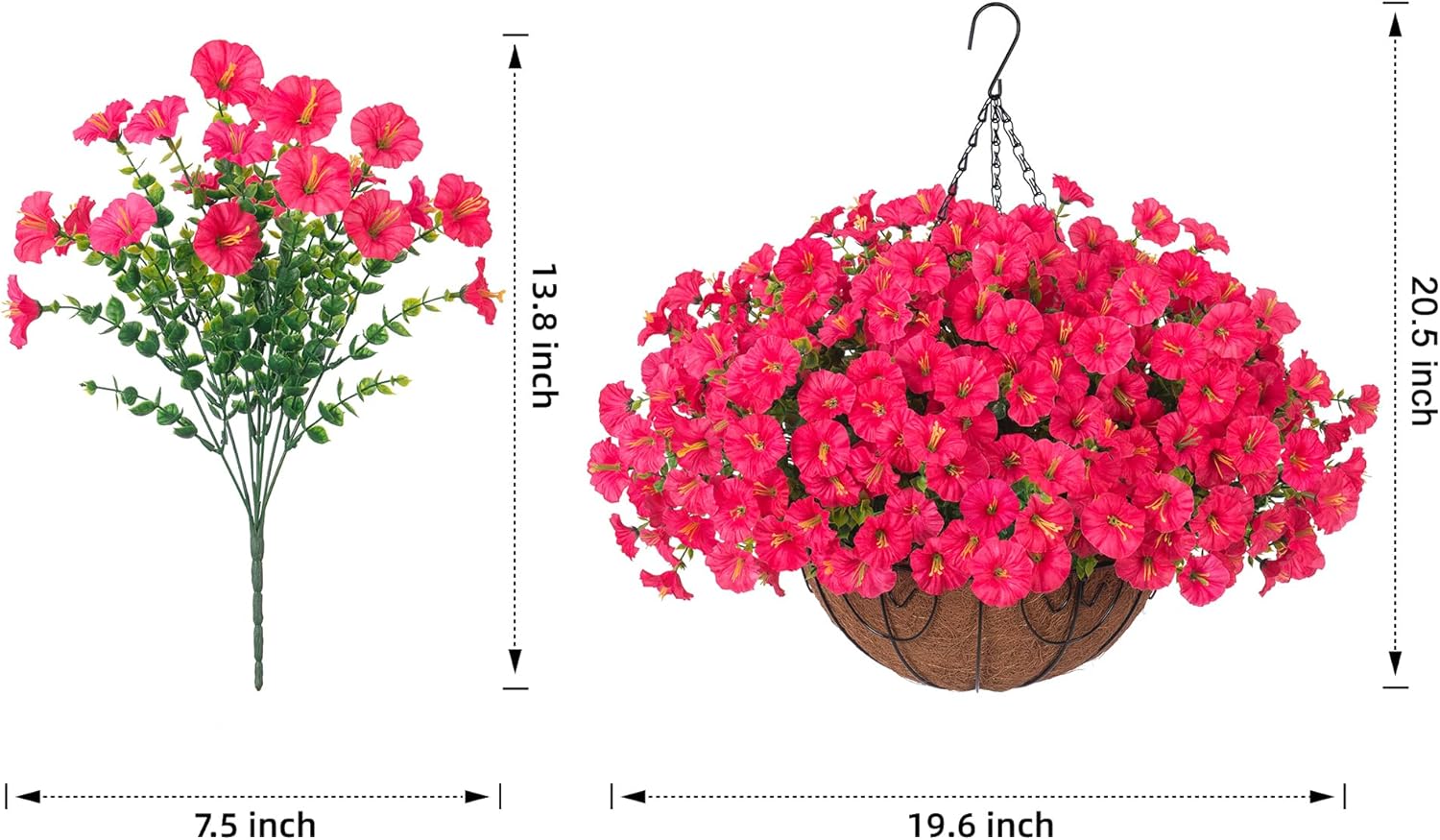 - π’ Artificial Hanging Morning Glory Flowers Basket: Package include 12 bundles Realistic silk morning glory match with green eucalyptus leaves, 1 Hanging Basket with chain, 1 foam, 1 green hat. Enjoy vibrant blooms year-round, regardless of the season or weather conditions.