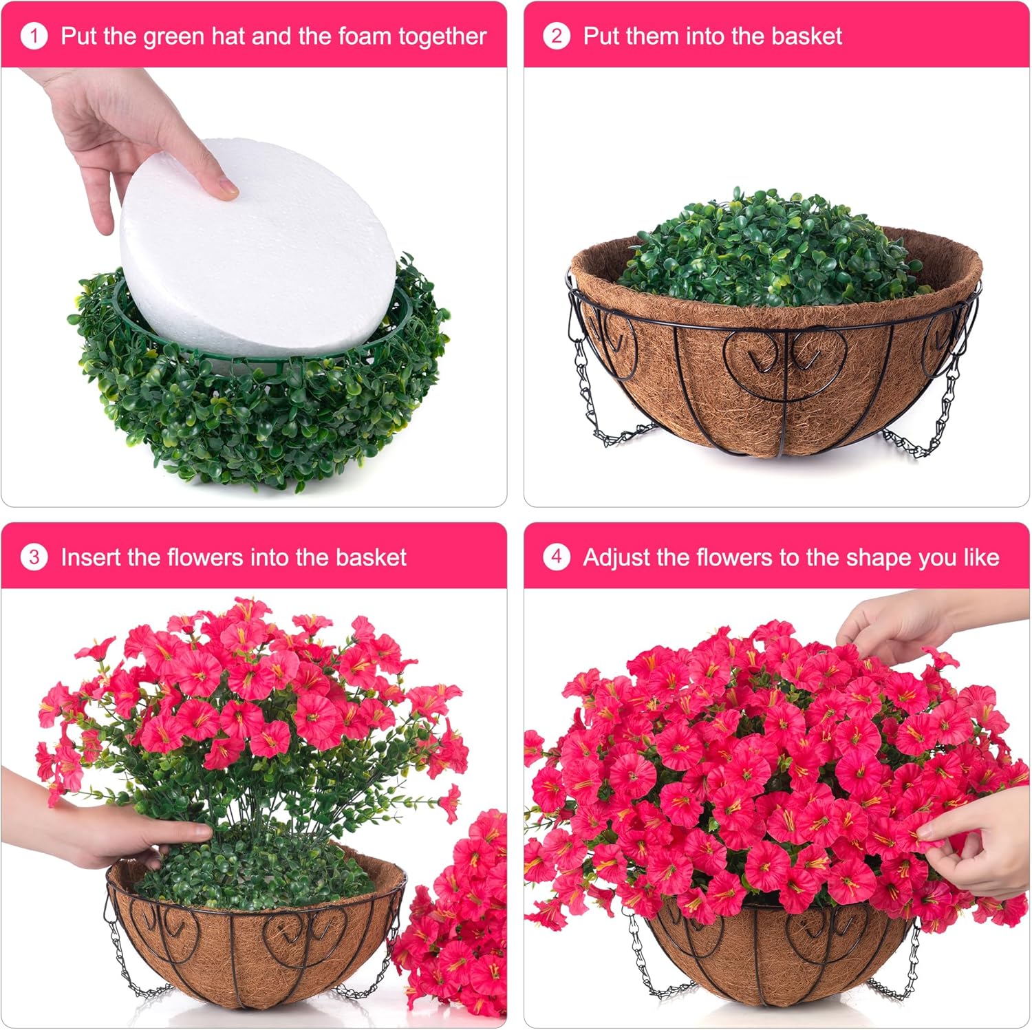 - π’ Easy Installation: The size after assembly is approximately 19.6" x 19.6" x 20.5 "(LxWxH); The basket measures 12" x 12" x 5.5"(LxWxH) and the chain length is 15 inches. Flower baskets are very easy to assemble. You just need to arrange the flowers according to your preference.