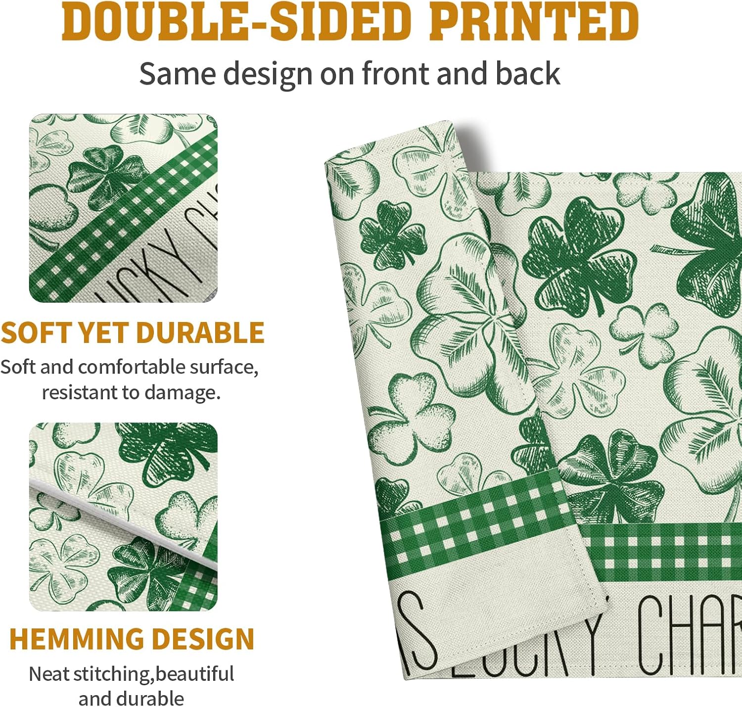 - EASY TO CARE: Saint Patricks Day placemats are machine washable, laid flat to dry. Do not bleach. Keep as good as new after washing. Combined with practicality and aesthetics, it is easy to fold and occupies a small area. No wrinkles, no shrinkage