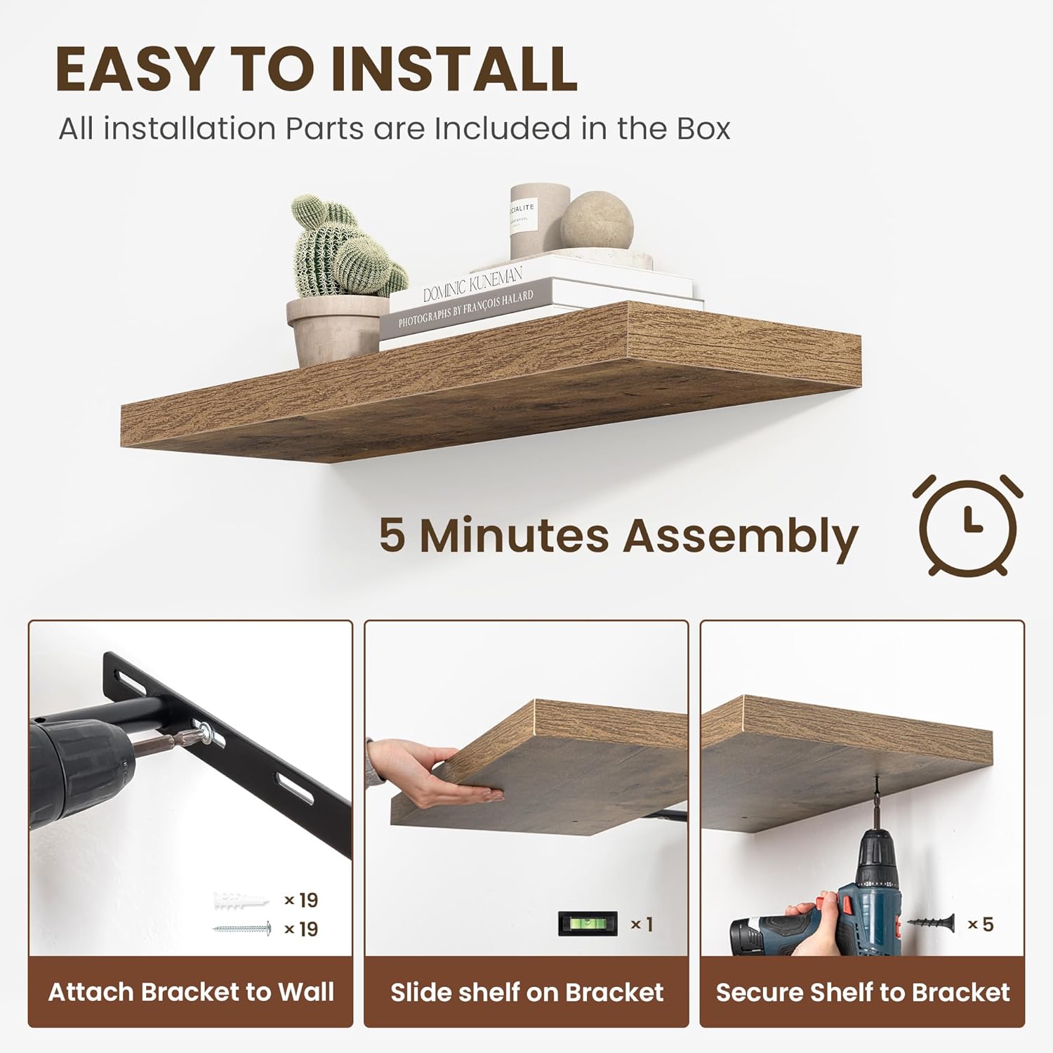 - ăEasy InstallationăDesigned with user convenience in mind, these shelves come with all necessary mounting hardware and clear instructions. You can have them up and ready to use in less than 5 minutes. Plus, our customer service is always ready to assist with any queries or concerns, ensuring a hassle-free experience