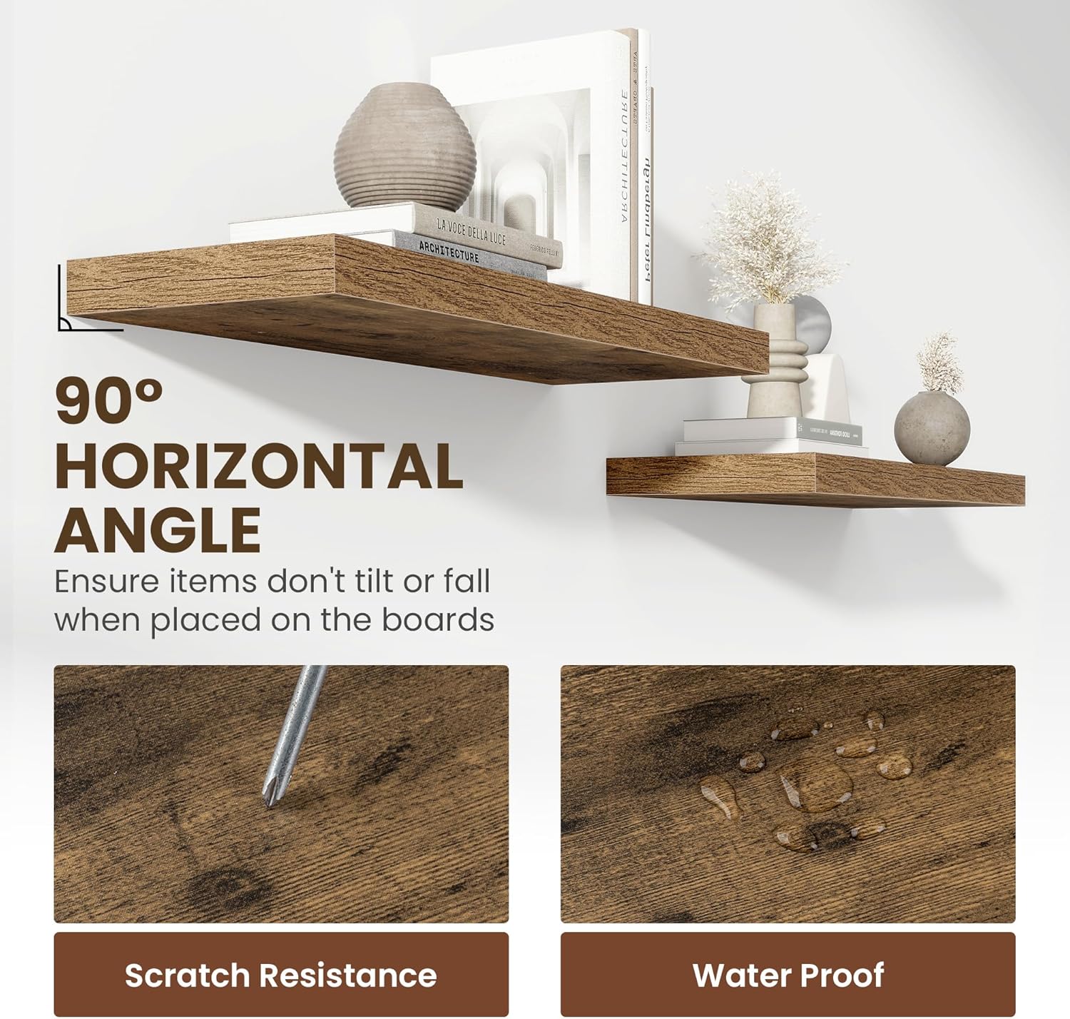 - ăPremium Quality ConstructionăCrafted from high-grade engineered wood with an invisible one-piece bracket, these floating shelves offer a robust and sleek design. The rustic wooden grain finish not only adds a touch of elegance but also infuses warmth into any room, making them a perfect fit for both modern and traditional interiors.