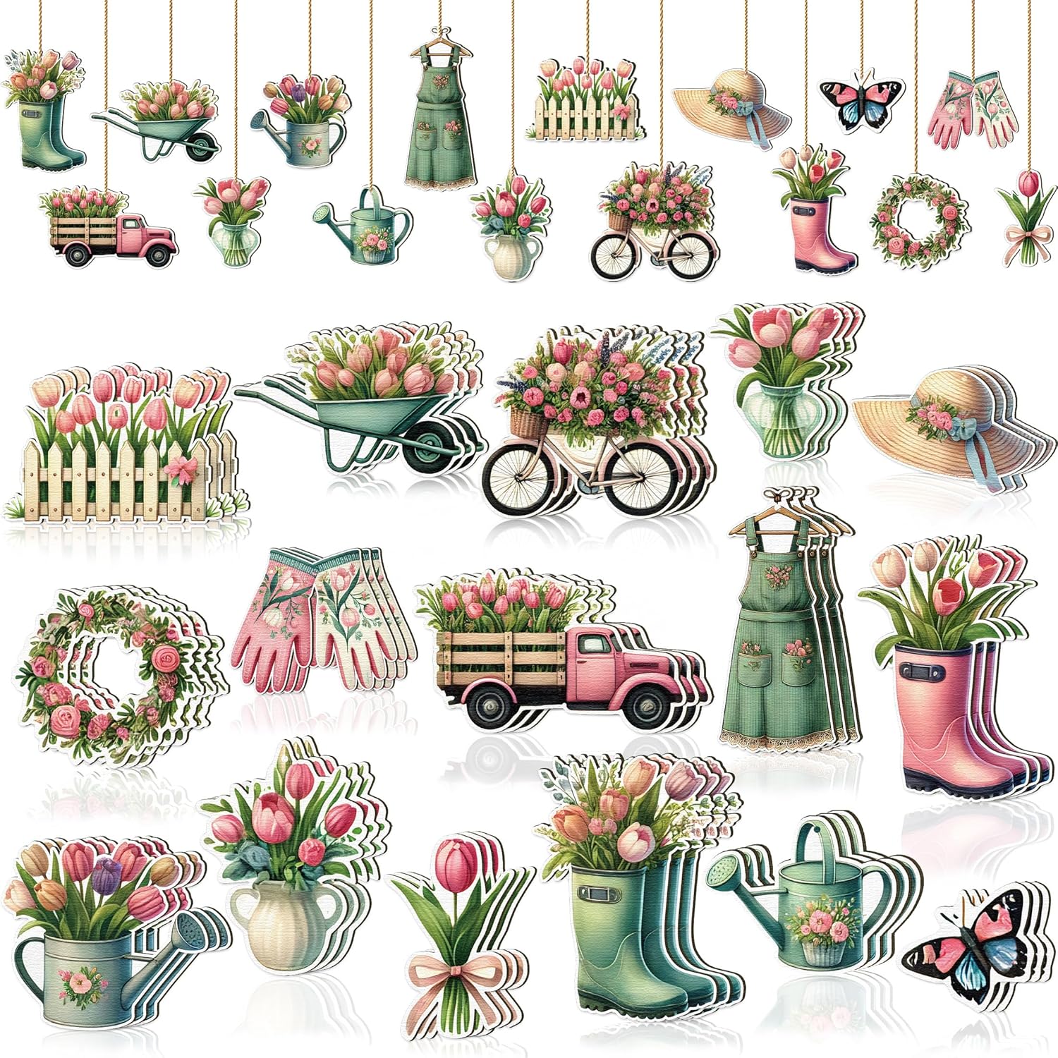 48PCS Spring Decor Wooden Flowers Ornaments Hanging Tulips Signs Decorations for Home Small Tree Party