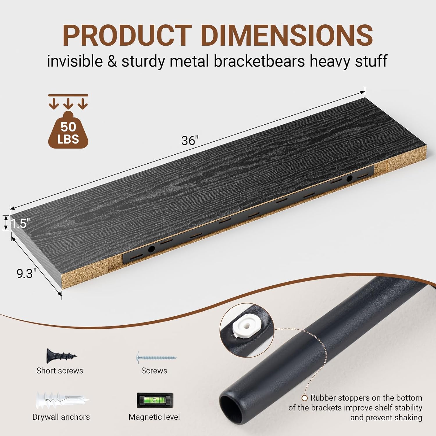 - ăSturdy & Reliable MaterialăThe 36 Floating shelf for wall use metal brackets and screws to be firmly fixed to the wall without sagging.Our floating shelves 36 inch are made of high quality MDF material,can hold up to 50 lbs to safely place your items.