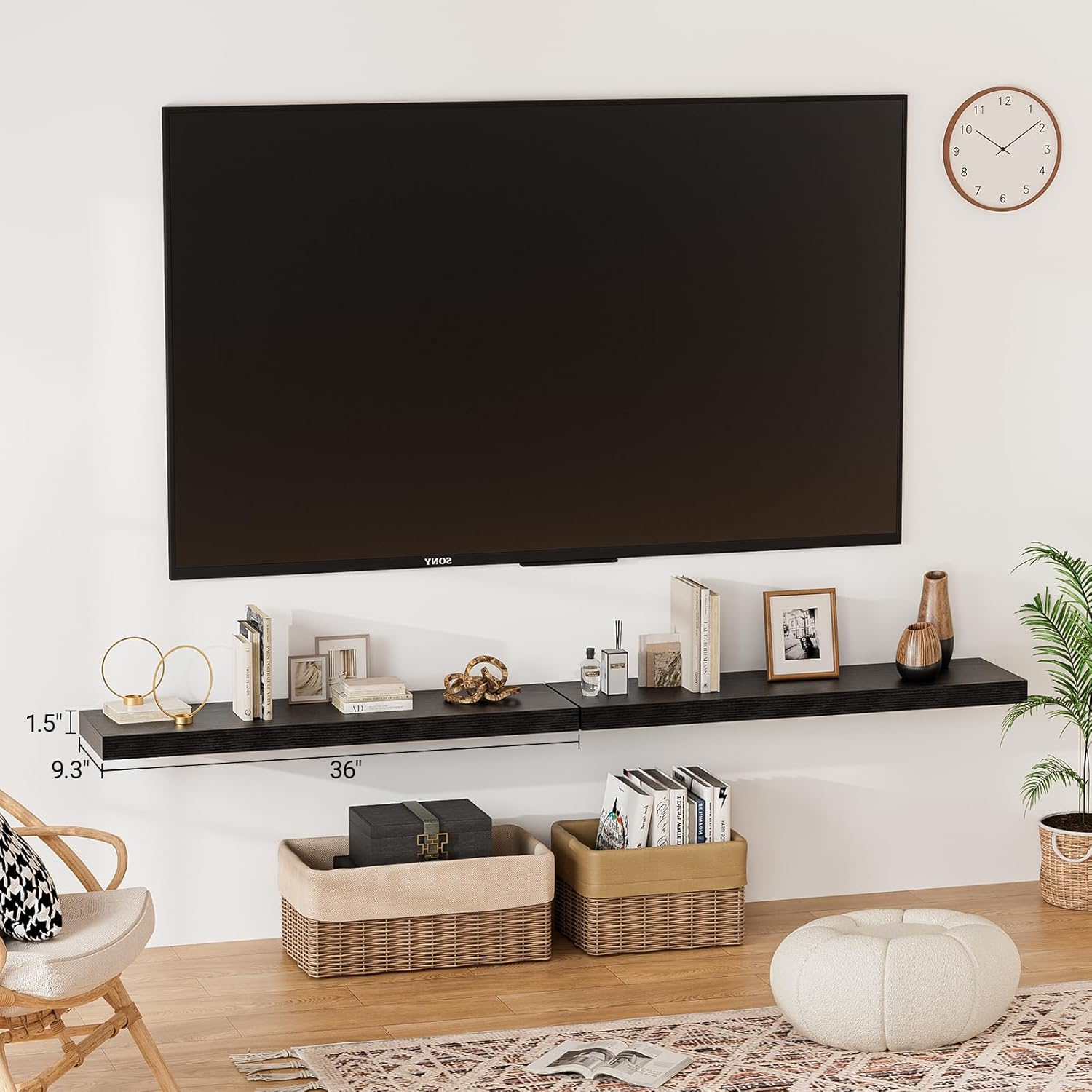 - ăLonger DesignăOur pretty 36 inch wall shelves are 36"W x 9.3"D x 1.5"H.Our black shelves for wall is longer than traditional designs and can hold more items.The 36 inch floating shelf optimize wall space,helping organize essentials without taking up floor space in your home.