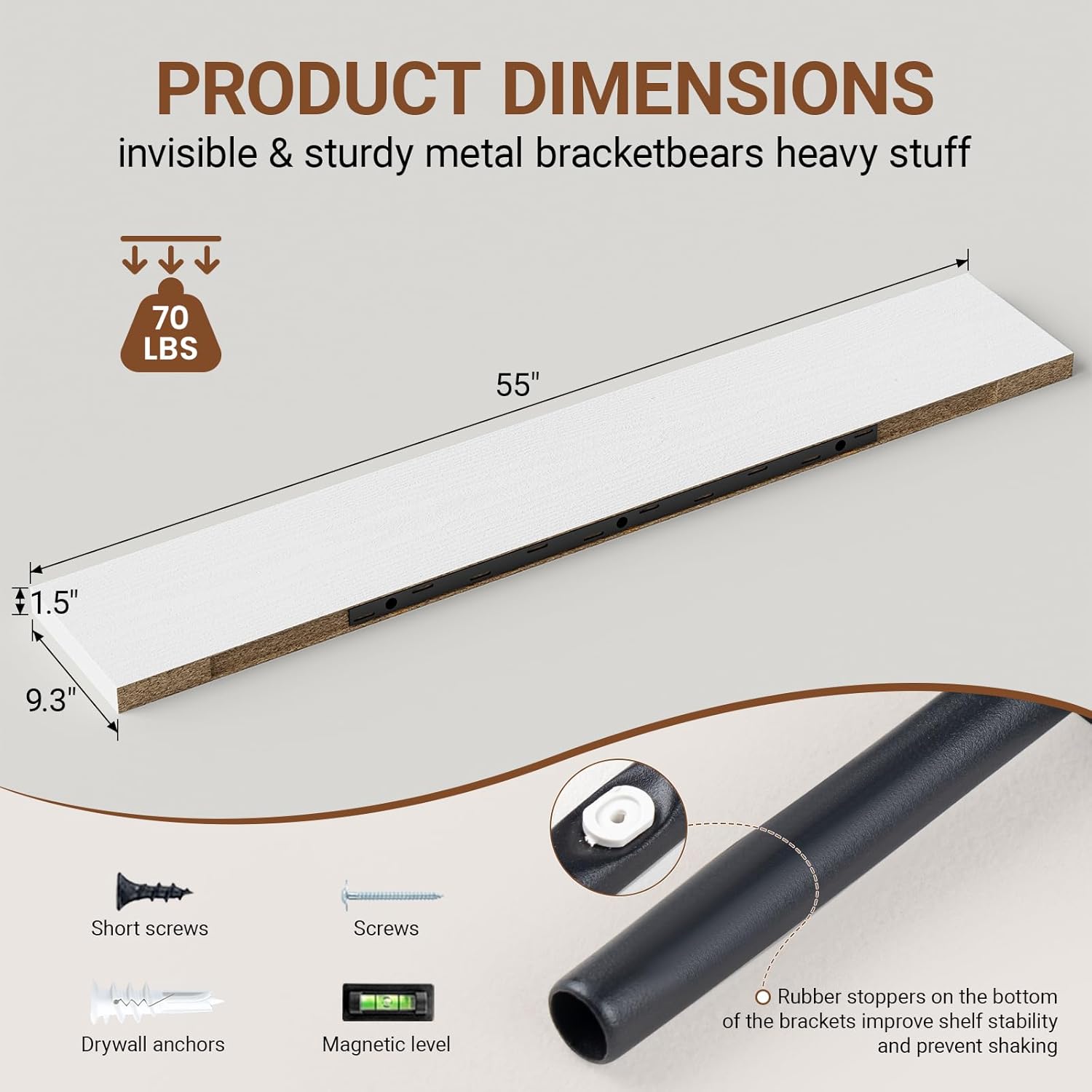 - ăLonger DesignăOur pretty white floating shelves are 55"W x 9.3"D x 1.5"H.Our white floating shelf is longer than traditional designs and can hold more items.The floating shelf optimize wall space,helping organize essentials without taking up floor space in your home.