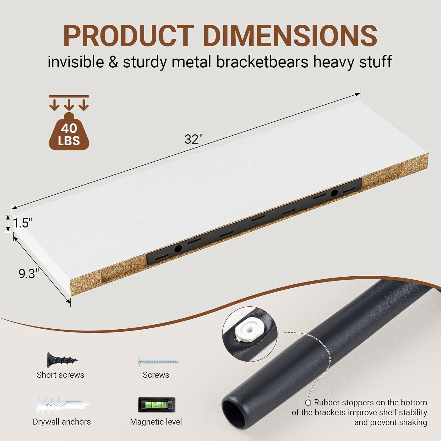 - ăSturdy & Reliable MaterialăThe white floating shelves for wall 32 inches long use metal brackets and screws to be firmly fixed to the wall without sagging.Our white floating shelf are made of high quality MDF material,can hold up to 40 lbs to safely place your items.