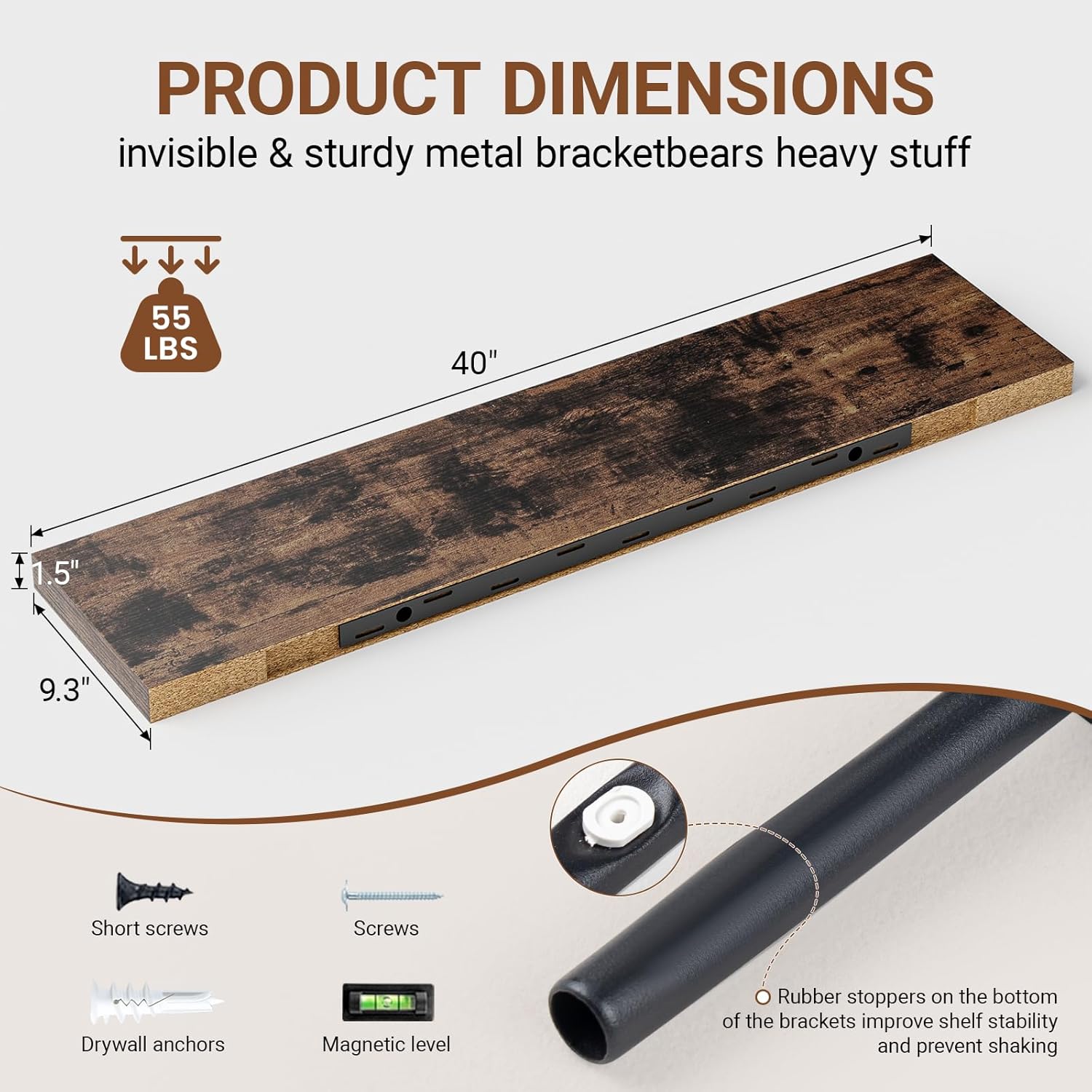 - ăSturdy & Reliable MaterialăThe dark brown floating shelves use metal brackets and screws to be firmly fixed to the wall without sagging.Our 40 inch floating shelf are made of high quality MDF material,can hold up to 55 lbs to safely place your items.