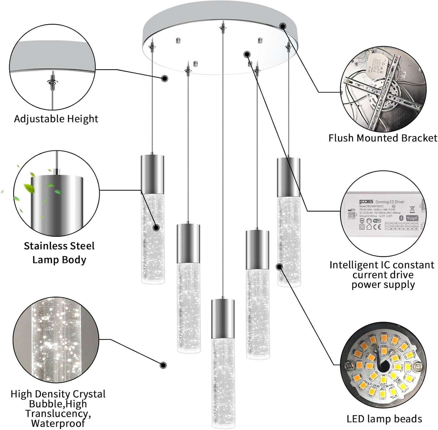 OKELI Smart Dimmable LED 5-Light Pendant Light for Kitchen Island, 18W 1350LM Modern Bubble Crystal Island Light Fixture with TUYA App & Voice Control, Adjustable 3000K-6000K, Electro-Chrome